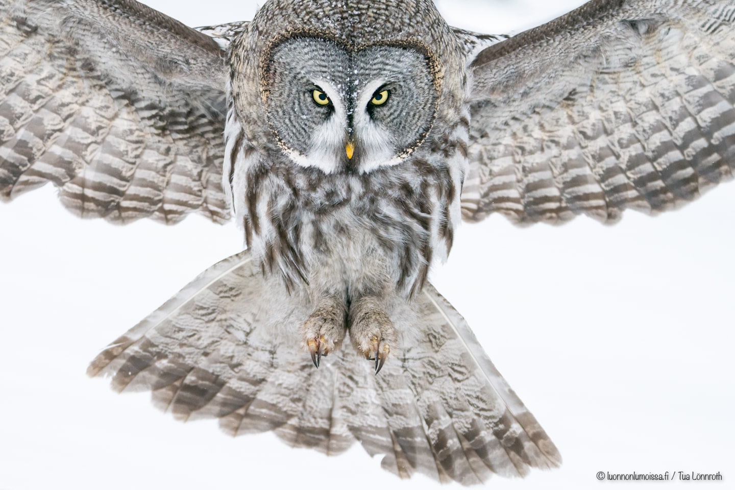 Kohtuullinen sää on sekin suhteellinen käsite, keli ei ollut enää edes lonkeron harmaa, vaan aivan totaalisen pimeä. Puhumattakaan taivaalta tippuneesta veden, rännän ja lumen yhdistelmästä. Lumisade on parhaimmillaan loistava elementti luontokuvauksessa, mutta parhaat sateet eivät tänäänkään osuneet yksiin pöllön suunnitelmien kanssa.
