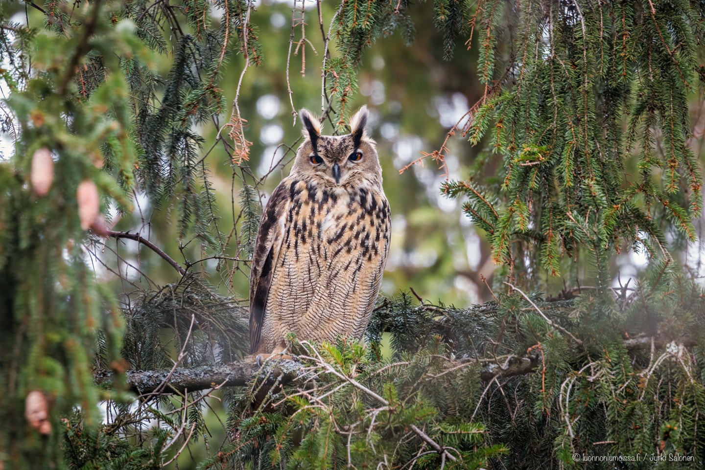 "Harmaan päivän huuhkaja" oli väkisin mielessä otsikkoa miettiessä. Jospa vielä jonain päivänä saisi otsikoida huuhkajakuvan tyyliin: "Upean iltavalon tuijottaja" tms.