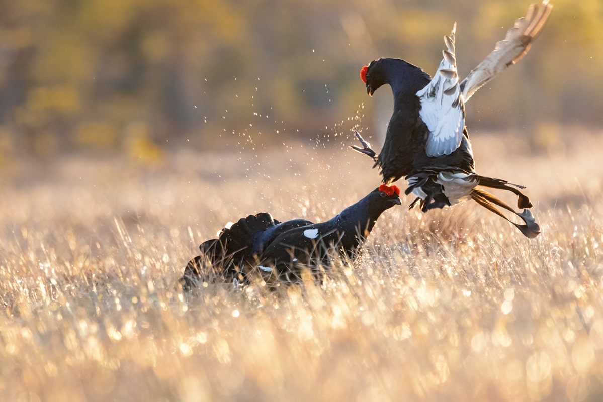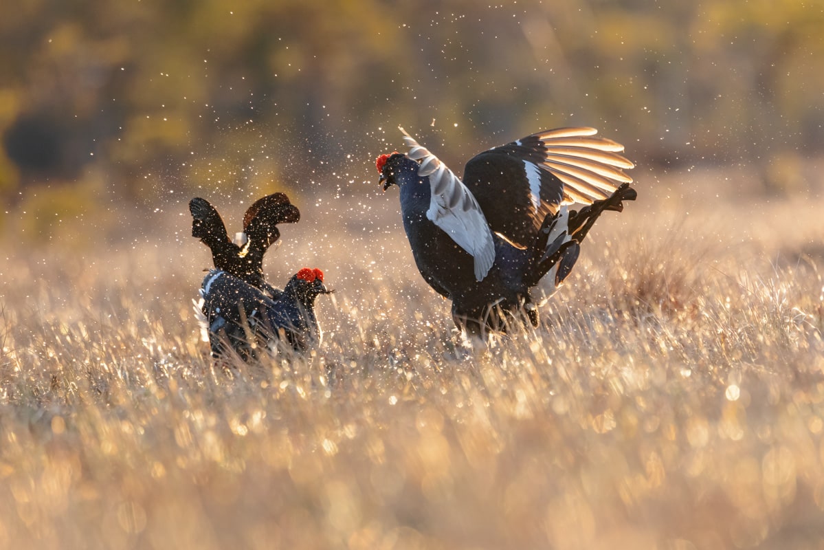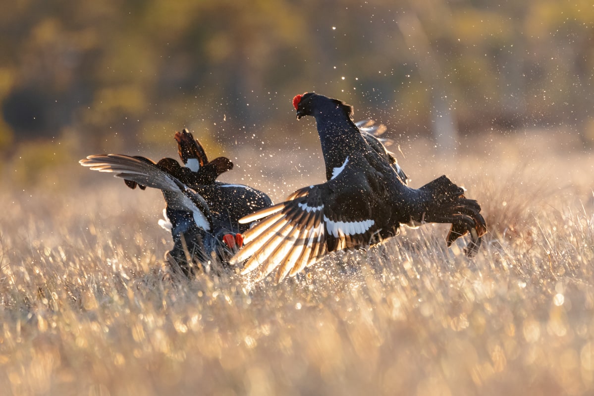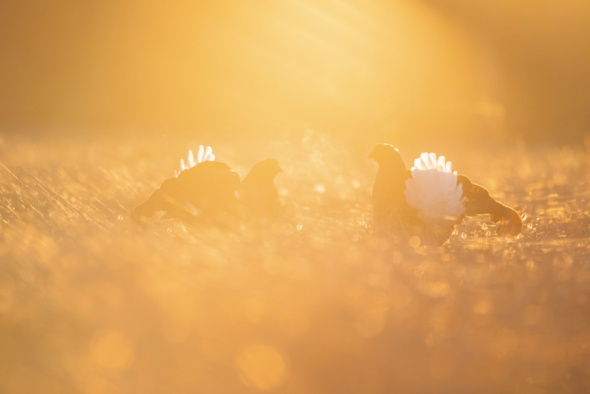 Ensialkuun teeret yleensä viivähtävät läheisissä puissa tarkkailemassa ympäristöä. Jos paikka tuntuu rauhalliselta siirtyvät taistelijat maahan ja hetken tuumaustauon jälkeen koko suo herää henkiin, kun teeret alkavat pulputuksensa. Yläreunan videosta kannattaa napata äänet päälle. Aamuisen teerisuon äänimaailma kurkien huutoineen on huikea.
