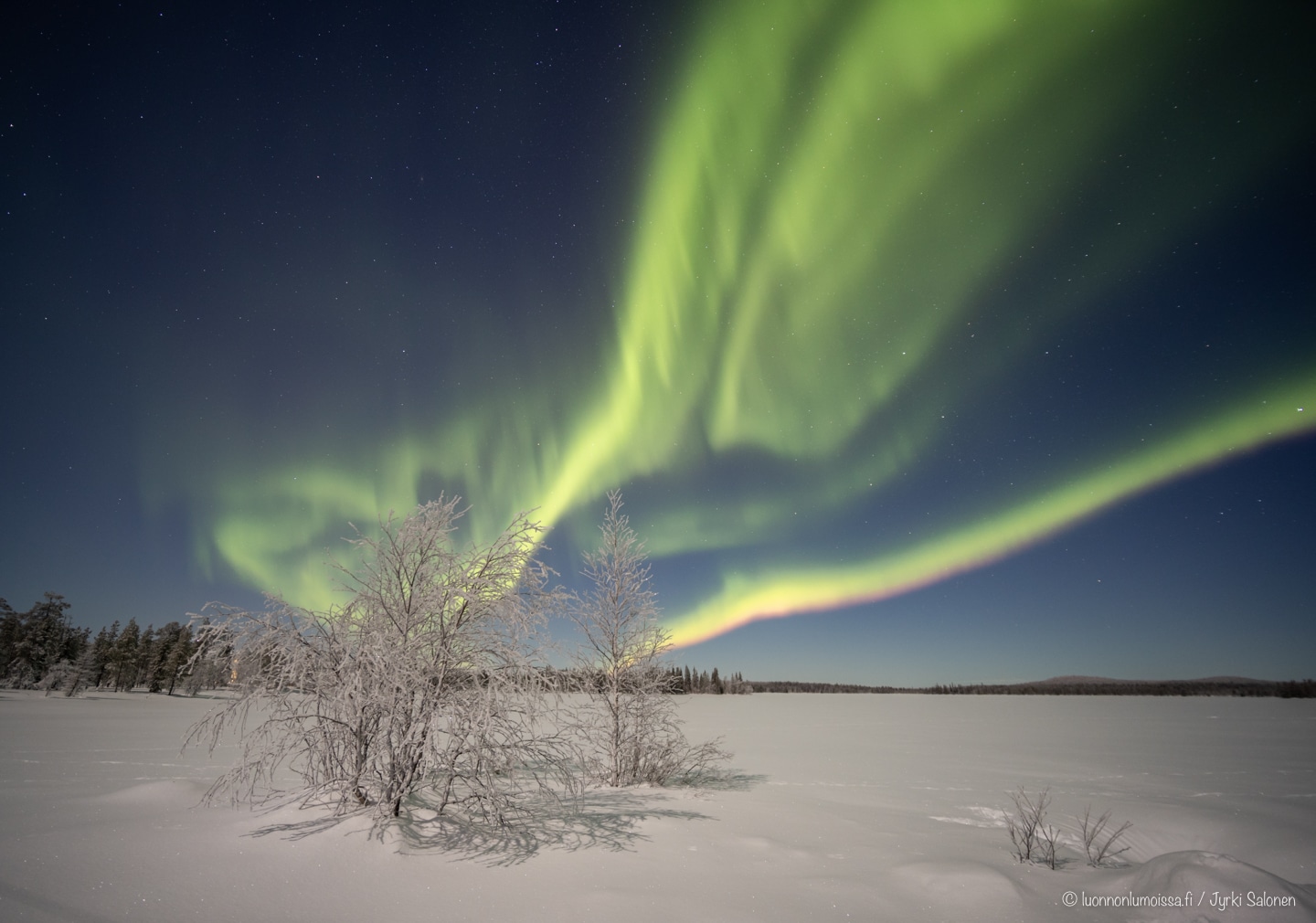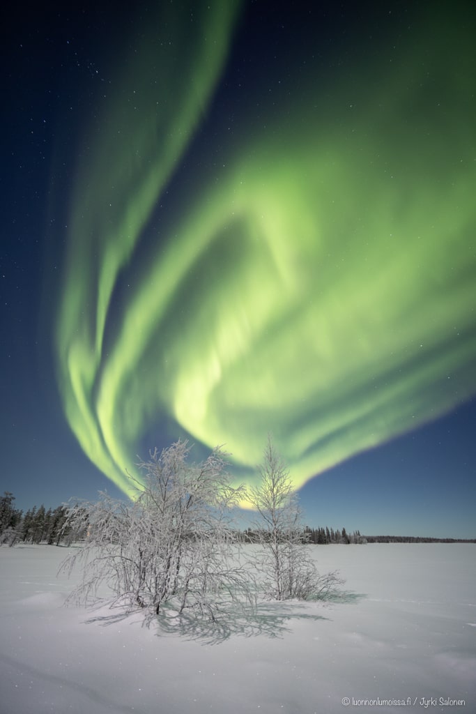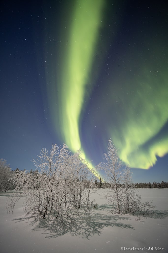 Taivaalla leimuavat komeimmat tulet, mitä olemme vähään aikaan nähneet, eikä kuvista tule mitään. Tilanne oli hämmentävä. Onko jalusta huonosti pehmeässä hangessa? Heilutanko itse jalustaa seisomalla jäällä sen vieressä? Onko pikakiinnityslevy huonosti kamerassa kiinni? Kauniin tasaisista tähtiviiruista päätellen joku osa jalustasta falskasi hitaasti, mutta varmasti valotuksien aikana.