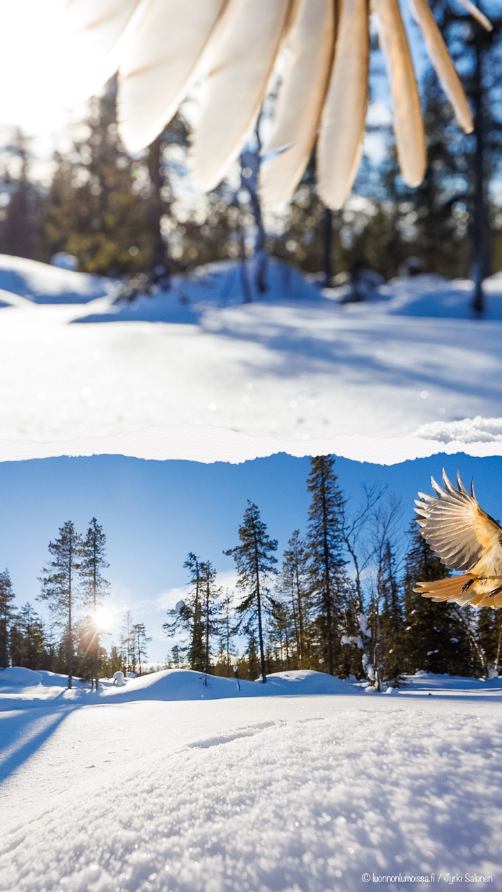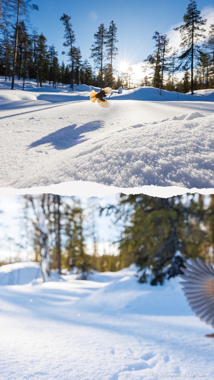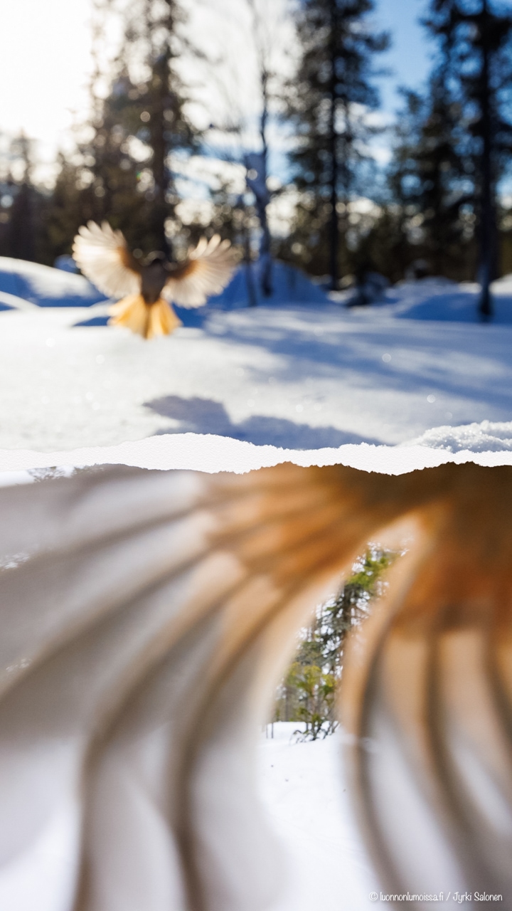 Lopulta jonkinlainen kompromissi saavutettiin ja kuukkelit saapuivat pelipaikoille suoraan sivulta. Tai toinen heistä saapui. Rohkeampi puolisko laskeutui laajakulmavisioihin sopivasti suoraan 30 sentin päähän kamerasta, mutta varautuneempi kumppani katsoi viisaammaksi laskeutua metrin päähän ja hypellä loppumatkan hangessa. Sama varautuneempi käytös oli havaittavissa myös edellisenä päivänä, mutta silloin ero oli sen verran pieni, että molemmista yksilöistä sai kuvia.