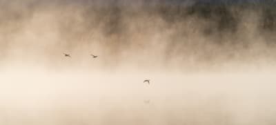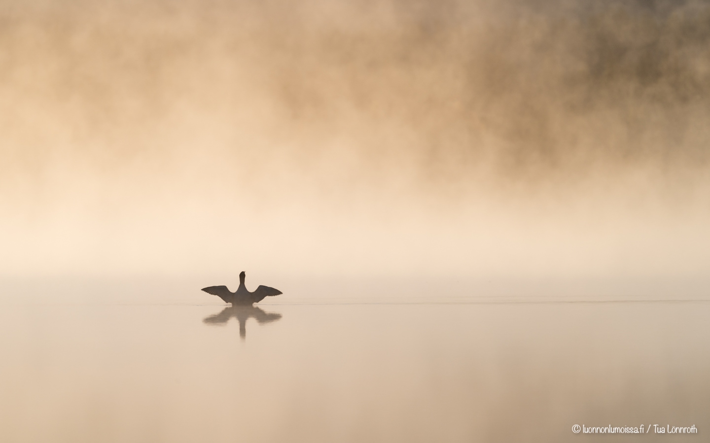 Aamun edetessä alkoi kuulua tuttu keväinen ääni. Teeret pulputtivat jossakin vastarannan puolella ilmeisesti syyssoitimelta. Järvi oli aivan autio, tai niin ainakin luulimme, mutta pikku hiljaa sumun suojista alkoi näkyä telkkiä, kuikkia ja isokoskeloita. Suurin osa oli kaukana, mutta koska järvi ei ole iso, saattoi niistä ihan kelpokuvia silti saada. Muutenkin kivempi kuvata sumu huomioon ottaen niin, että myös maisemaa tulee kuvaan. Matala kuvakulma toimii yleensä parhaiten mutta nyt kuvat näyttivät jäävän sumun takia epäteräviksi. Kamera tuntui tarkentavan automaatilla paremmin vähän korkeammalta kuvattuna.