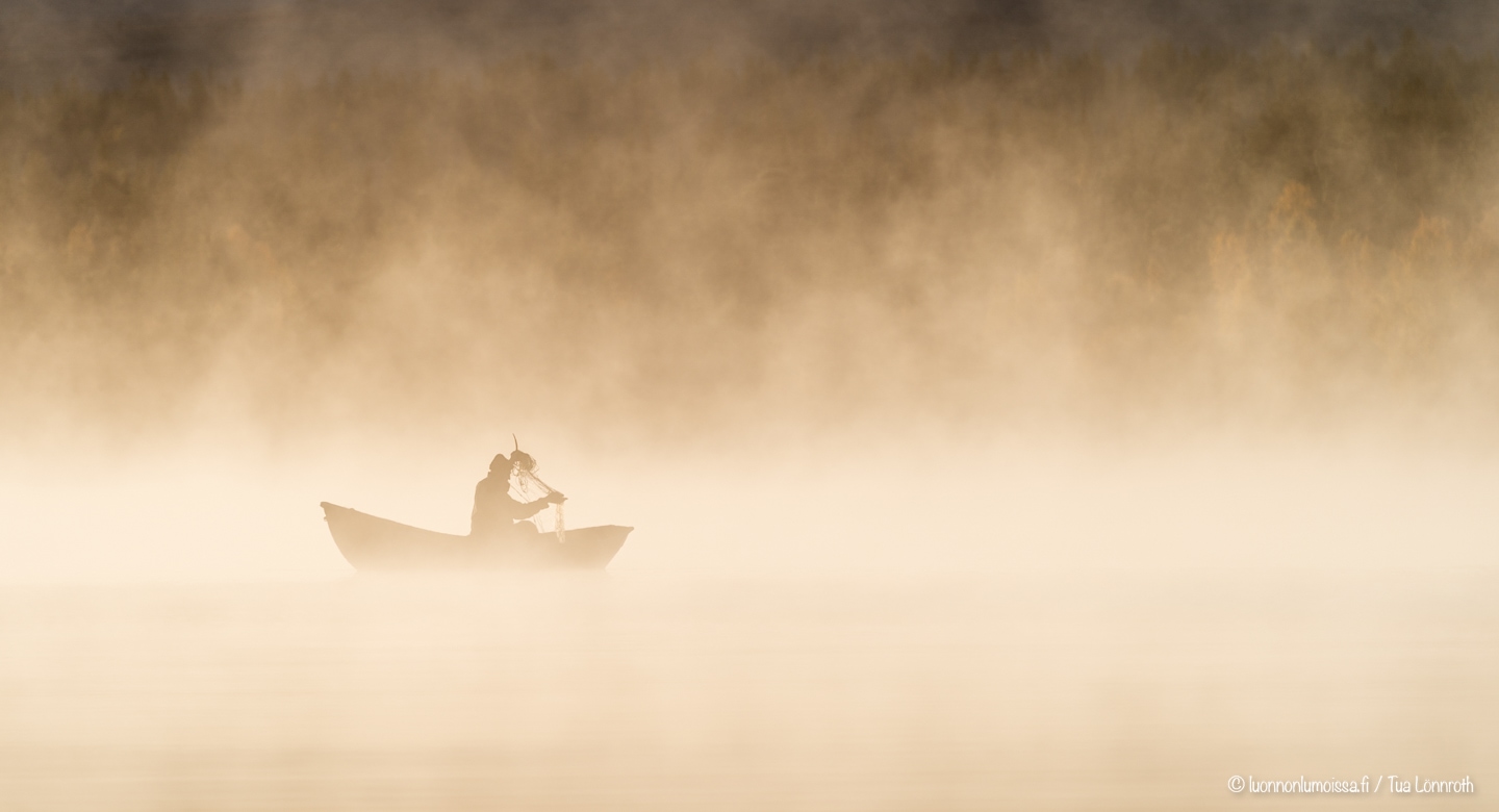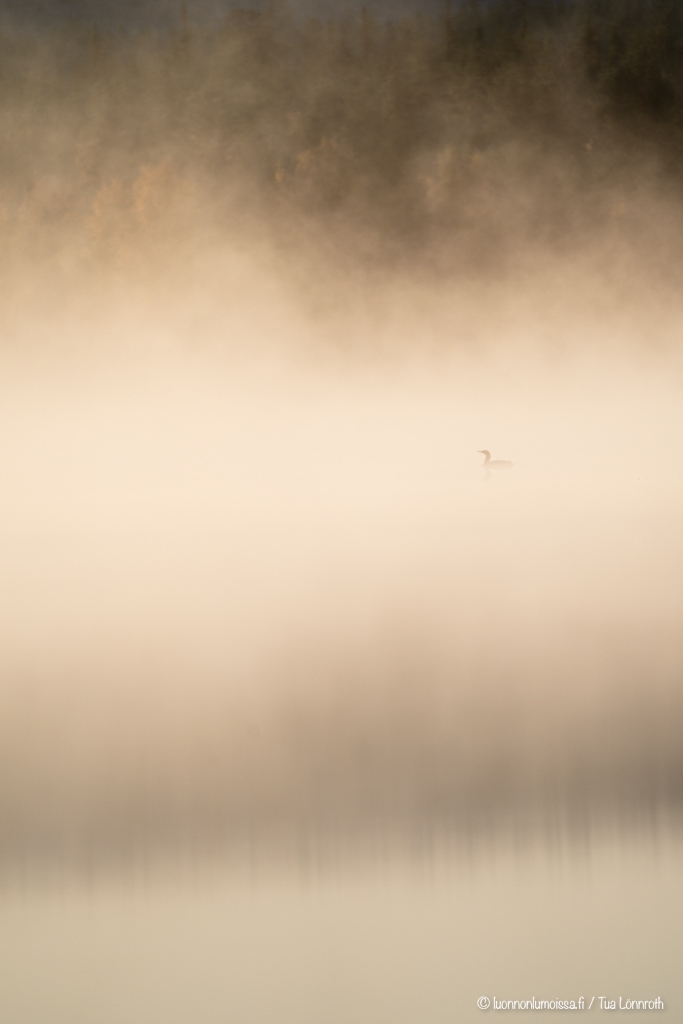 Viikko taisi olla optimaalinen ruskan sekä aamusumujen suhteen. Perjantai-aamunakin kömmimme aikaisin aamulla ylös, nyt kuitenkin puoli tuntia myöhemmin kuin muina sumuaamuina. Yöllä nukutti niin hyvin - ne viisi tuntia mitä ehdimme nukkua - että sänky tuntui houkuttelevalta, mutta emme halunneet päästää kaunista aamua karkaamaan ohi. Hyvä näin, näimme nimittäin nyt ensimmäistä kertaa majavan uiskentelevan järven poikki usvan seassa. Kuikka tuli myös paljon lähemmäksi ja siitä sai parhaat kuvat tähän mennessä. Aurinko teki hauskasti puiden latvojen yläpuolelle sumuun pieniä säteitä ja auringonnousu oli jälleen aivan mieletön. Ajatella, jos tämän näkymän olisi vaihtanut uniin. Emme voineet olla muuta kuin tyytyväisiä kaikkiin kolmeen usva-aamuun. Lopuksi sumun sekaan tuli vielä kalastaja soutaen verkkojaan nostamaan, ei hullumpi lisä usvan sekaan sekään. Pakkasta oli suunnilleen neljä astetta ja kuura oli jälleen peittänyt aluskasvillisuuden.