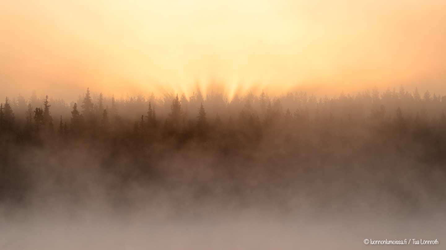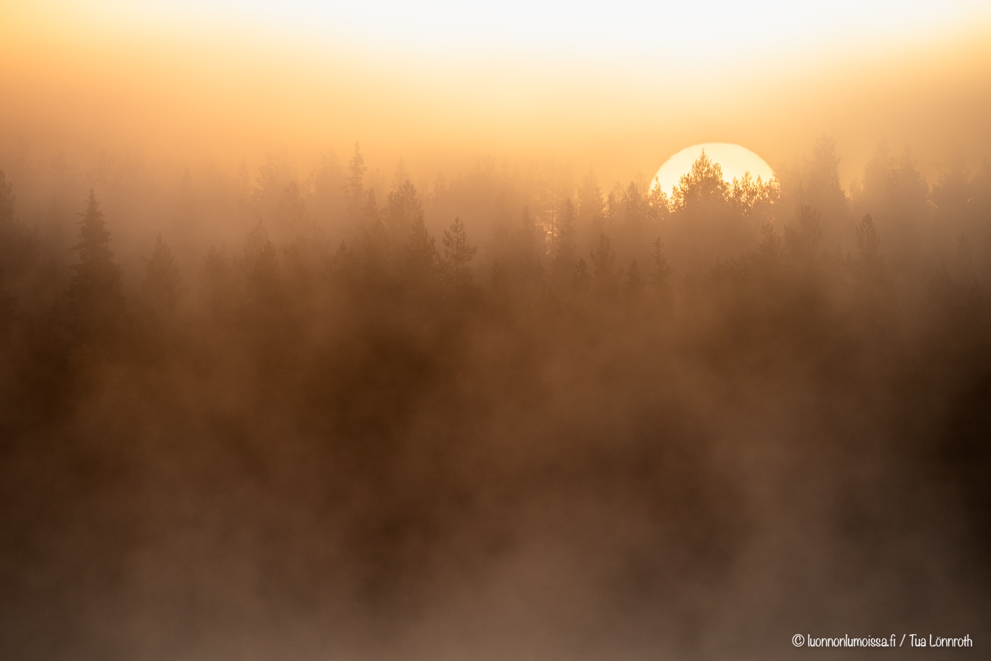 Nukkumaan pääsimme vasta alkuyöstä, koska oli kirkasta ja revontulet leimusivat kauniisti järven yllä. Yöllä oli vaikea saada unen päästä kiinni, kun olin aivan jäässä ulkona pari tuntia paikallaan seisomisen jälkeen. Lisäksi olo oli kuin pikkulapsella karkkikaupassa, kun odotin innolla aamua. Kello pärähti kuudelta soimaan, puoli tuntia ennen auringonnousua. Päätimme syödä aamupalan vasta sisälle palattuamme ja sovimme, että menemme vielä pariksi tunniksi nukkumaan sumukuvailujen jälkeen. Järvi oli henkeäsalpaavan kaunis usvan leijaillessa veden päällä, osittain peittäen vastarannan puut. Vielä oli hämärää mutta pian aurinko nousi värjäten usvan kullankeltaiseksi. Oli vaikeuksia päättää, millä lasilla kuvaisi, ja se menikin sellaiseksi säheltämiseksi, kun kaikkia piti kokeilla. Auringon noustessa on vieläpä oltava todella nopea, koska se on vain hetken kuvauksellinen puiden takaa kurkistaessa, sen jälkeen onkin jo ihan liian kirkasta. Sumu kuitenkin sakeni uudelleen auringon ollessa jo hetken näkyvissä, peittäen auringon niin, että se näkyi kauniina pallona, jolloin siitä sai taas kuvia.