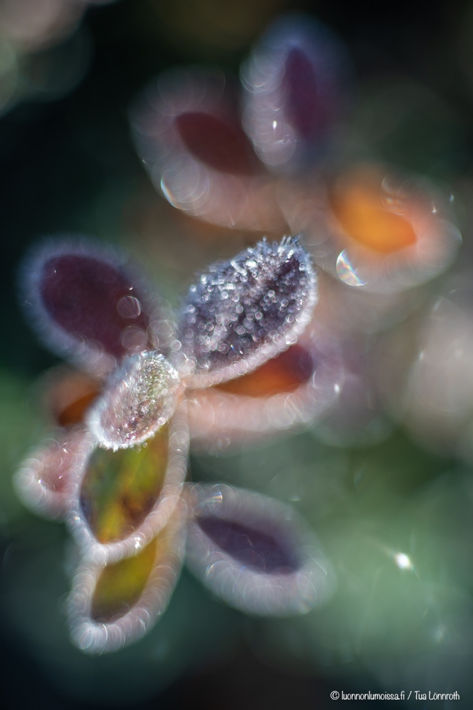Sumua kesti ilahduttavan pitkään ja lisäksi mökin takapihalta löytyi lisää kuvattavaa. Siinä on soisempaa maastoa vaivaiskoivuineen ja kasteen peittämä varvikko hohti vastavalossa nätisti. Kuvaamiset lopetimme kymmenen maissa ja nälkä oli valtaisa. Nukkumaan emme enää kehdanneet mennä vaan aamupalan jälkeen lähdimme tekemään muita Lapinhullujen touhuja.