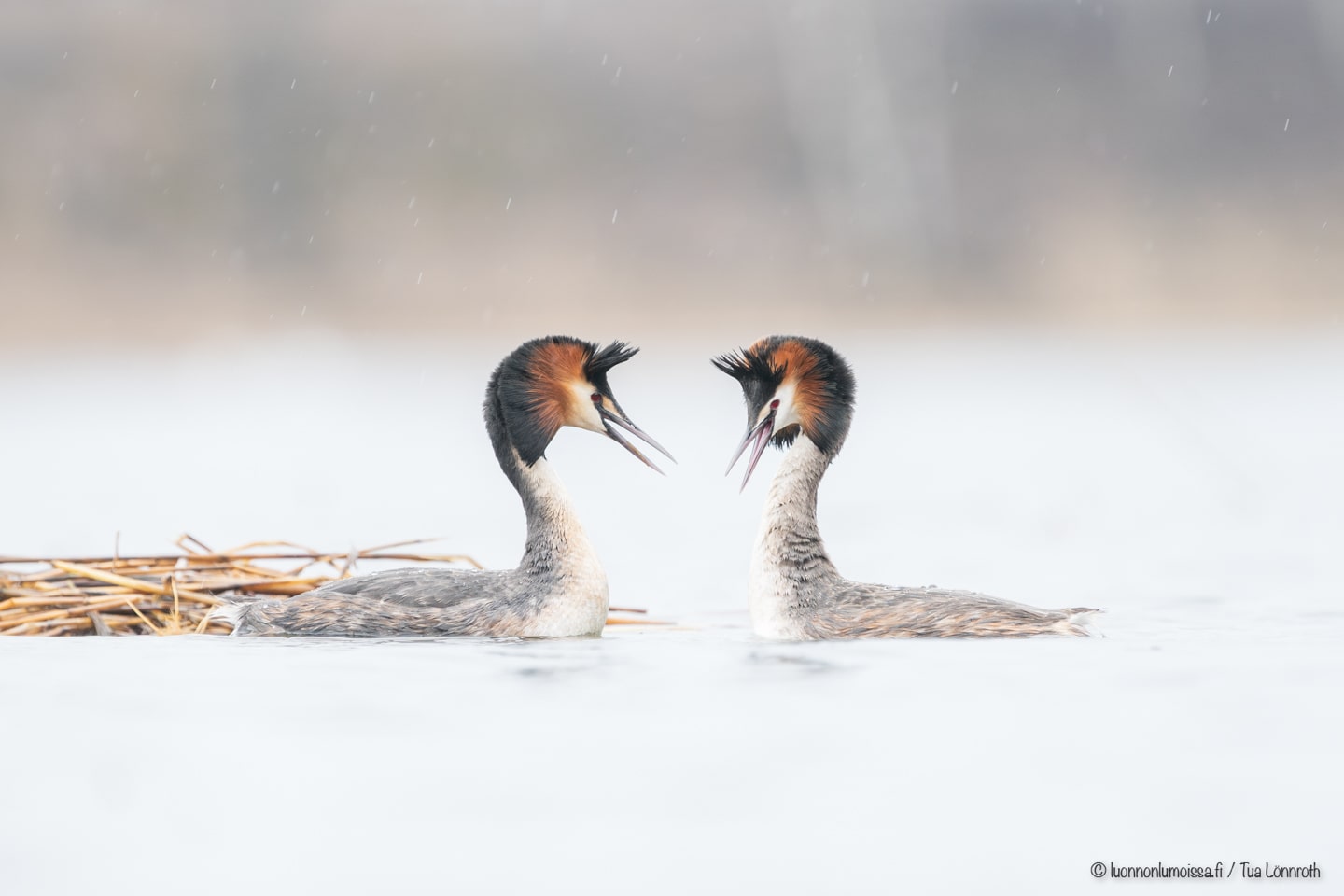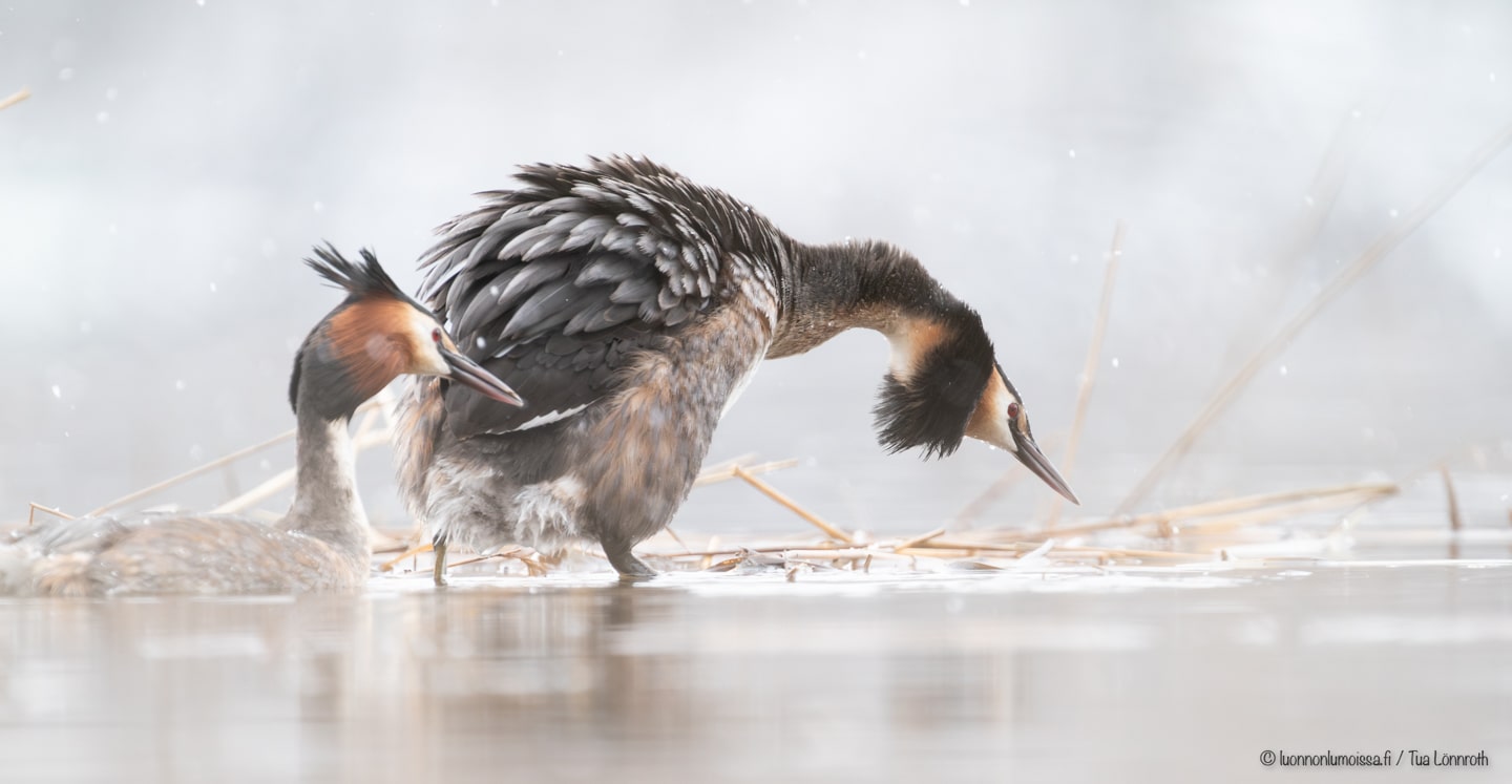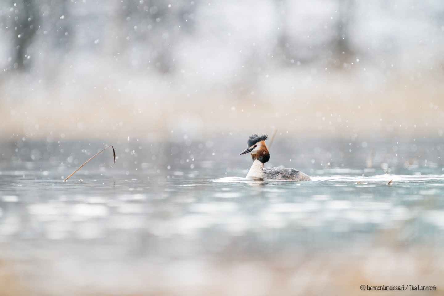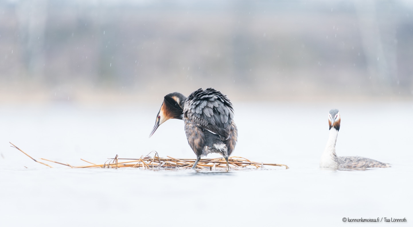 Huhtikuussa lintujen paluumuutto on vilkasta ja silkkiuikkujen saavuttua pesimäpaikoilleen, alkavat näyttävät soidinmenot. Reviiritaistelut ovat kiihkeitä, kuten myös parittelut. Joka kerta ei kuitenkaan onnista, joskus näyttää siltä, että koirasta ei voisi vähempää kiinnostaa ja joskus jokin menee niin pieleen, että naaras nostaa päänsä kesken kuuminta huumaa. Oli huvittavan näköistä, kun pariskunta ryhtyi ravistelemaan päitään kun koiras oli vielä naaraan päällä. Pääsimme seuraamaan tänä keväänä näitä sulavalinjaisia lintuja suhteellisen läheltä, mutta kelissä olisi ollut toivomisen varaa. Iltavalot jäivät unelmien tasolle ja piti tyytyä pilvisen kelin harmauteen, välillä jopa sateeseen. Yhtenä päivänä satoi lunta koko päivän - koska takatalvi - ja se toi kaivattua piristystä olosuhteisiin. Paikka ei vaan sovellu kovin hyvin lumisadekuviin, tausta on kaukana ja lumisade ei siten pääse kuvissa oikeuksiinsa.