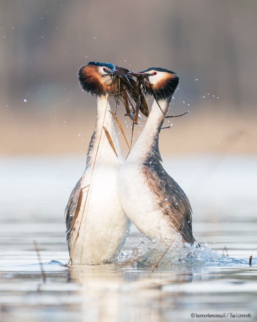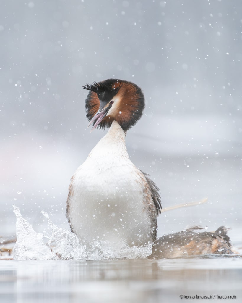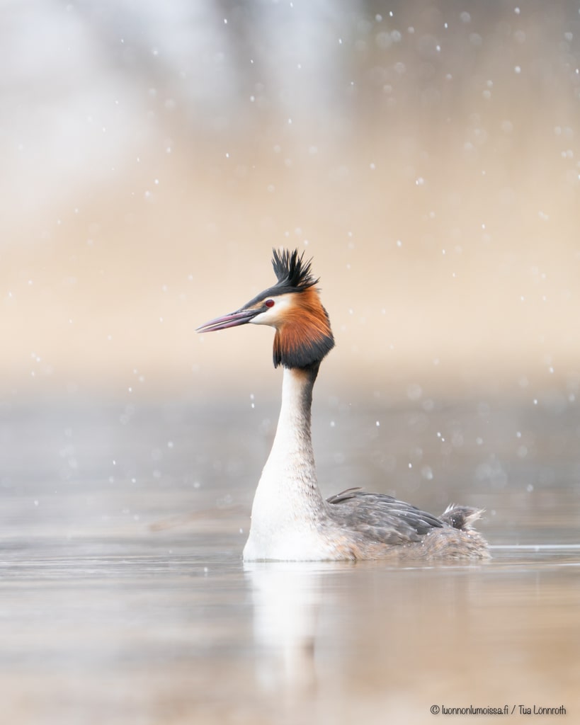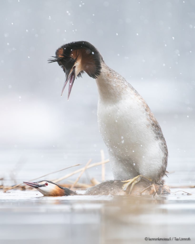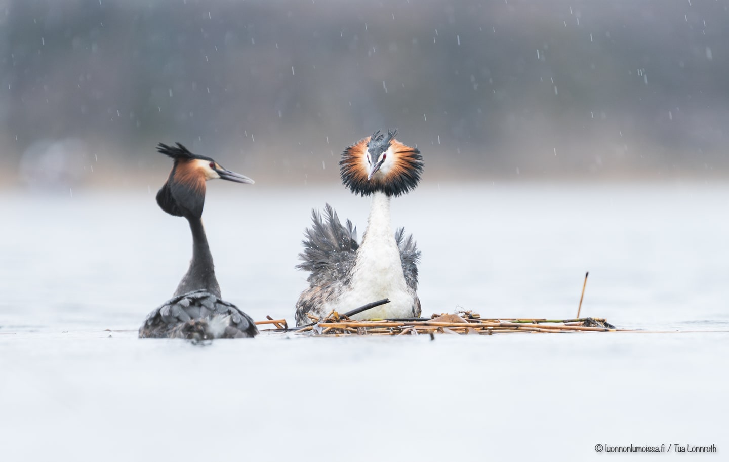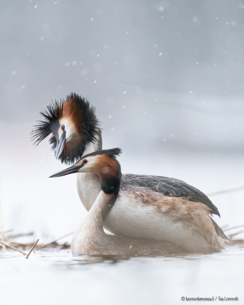 Huhtikuussa lintujen paluumuutto on vilkasta ja silkkiuikkujen saavuttua pesimäpaikoilleen, alkavat näyttävät soidinmenot. Reviiritaistelut ovat kiihkeitä, kuten myös parittelut. Joka kerta ei kuitenkaan onnista, joskus näyttää siltä, että koirasta ei voisi vähempää kiinnostaa ja joskus jokin menee niin pieleen, että naaras nostaa päänsä kesken kuuminta huumaa. Oli huvittavan näköistä, kun pariskunta ryhtyi ravistelemaan päitään kun koiras oli vielä naaraan päällä. Pääsimme seuraamaan tänä keväänä näitä sulavalinjaisia lintuja suhteellisen läheltä, mutta kelissä olisi ollut toivomisen varaa. Iltavalot jäivät unelmien tasolle ja piti tyytyä pilvisen kelin harmauteen, välillä jopa sateeseen. Yhtenä päivänä satoi lunta koko päivän - koska takatalvi - ja se toi kaivattua piristystä olosuhteisiin. Paikka ei vaan sovellu kovin hyvin lumisadekuviin, tausta on kaukana ja lumisade ei siten pääse kuvissa oikeuksiinsa.