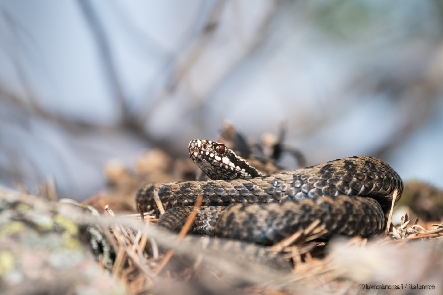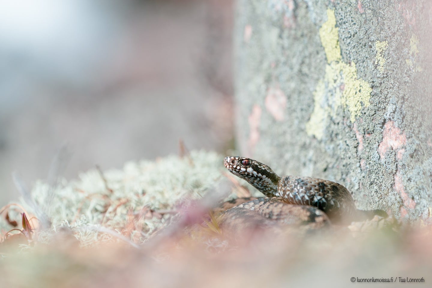 Käärmeet kuuluvat myös kevään ensimmäisiin kuvauskohteisiin. Pääsiäiseksi sattui pari aurinkoista päivää, joten suuntasimme kohti kyyparatiisia, saappaat jalassa. Hassusti vaisto käskee tömistelemään kävellessä vaikka sitä ei todellakaan voi tehdä, mikäli käärmeistä haluaa nähdä muutakin kuin poispäin vilistävän peräpään. Kyyt ovat vaikeita kuvauskohteita siinä mielessä, että ne tykkäävät olla mahdollisimman epäkuvauksellisissa paikoissa, varvikon tai kallionseinämän suojissa. Eikä pilvettömältä taivaalta porottava aurinkokaan luo kovin hyviä kuvausvaloja. Käärmeet ovat myös todella arkoja ja omien liikkeiden kanssa tulee olla mahdollisimman rauhallinen, ettei säikytä pelokasta luikertelijaa pois. Paratiisista pois lähtiessä törmäsimme sammakkoon. Näin aikaisin emme ole aiemmin sammakkoa nähneet. Aikamoisessa ryteikössä se oli mutta jonkun kuvan siitä saimme. Nämä taisivatkin jäädä tämän kauden ainoiksi.