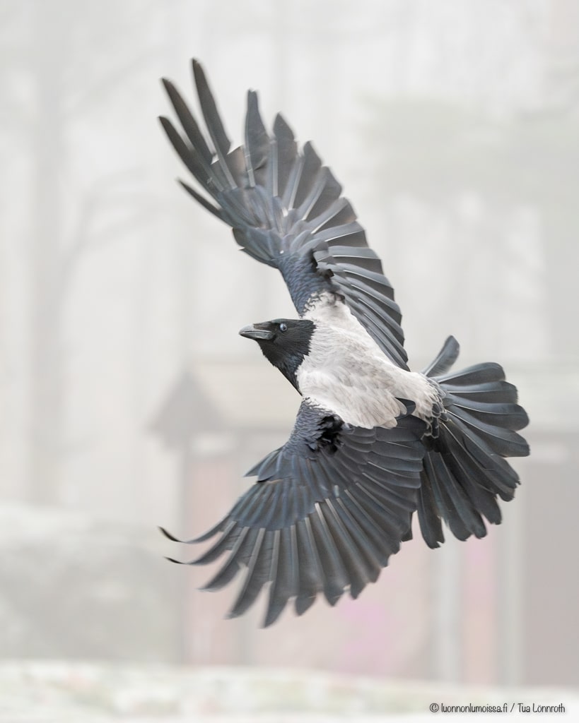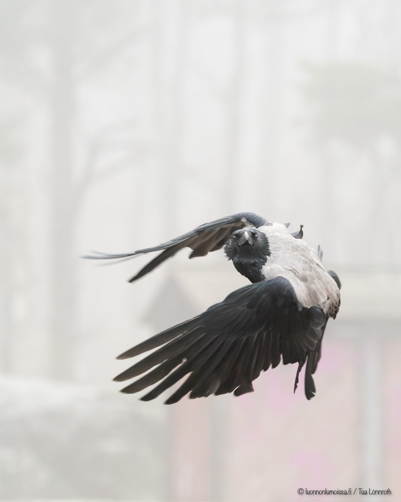 Lähdimme kävelemään rantaa pitkin ja pysähdyimme hetkeksi katselemaan aavemaiselle merelle. Sumu sakeni entisestään ja kun käännyimme, huomasimme variksen katselevan meitä kelopuun latvasta. Jyrki heitti sille pähkinän ja sen myötä paikalle kerääntyi lisää variksia. Otin muutaman kuvan mutta en uskonut saaneeni mitään kovin kummoista otosta, kunnes sitten kotona huomasin, että pari oli osunut aika hyvin kohdalleen. Sankka sumu toimi todella hyvin ja vaikka ensin harmittelin taustalla näkyvää töhrittyä rakennusta, toi sekin mielestäni kivasti vähän väriä muuten harmaaseen kuvaan. Varista tulee harvoin kuvattua, vaikka se on loppujen lopuksi hyvinkin kuvauksellinen lintu.