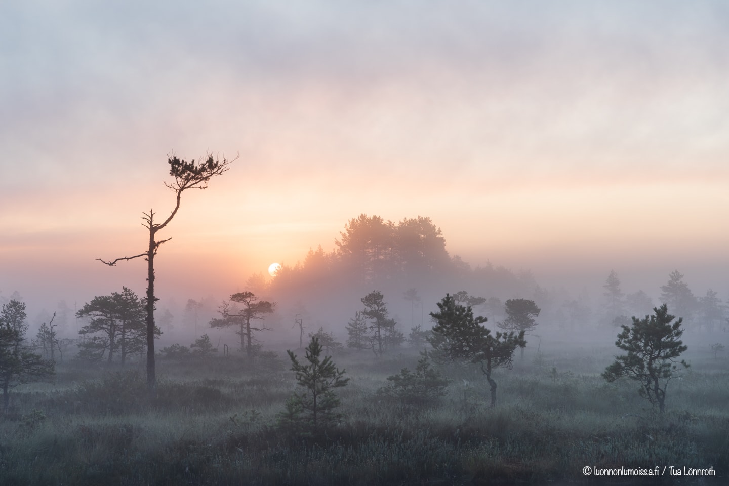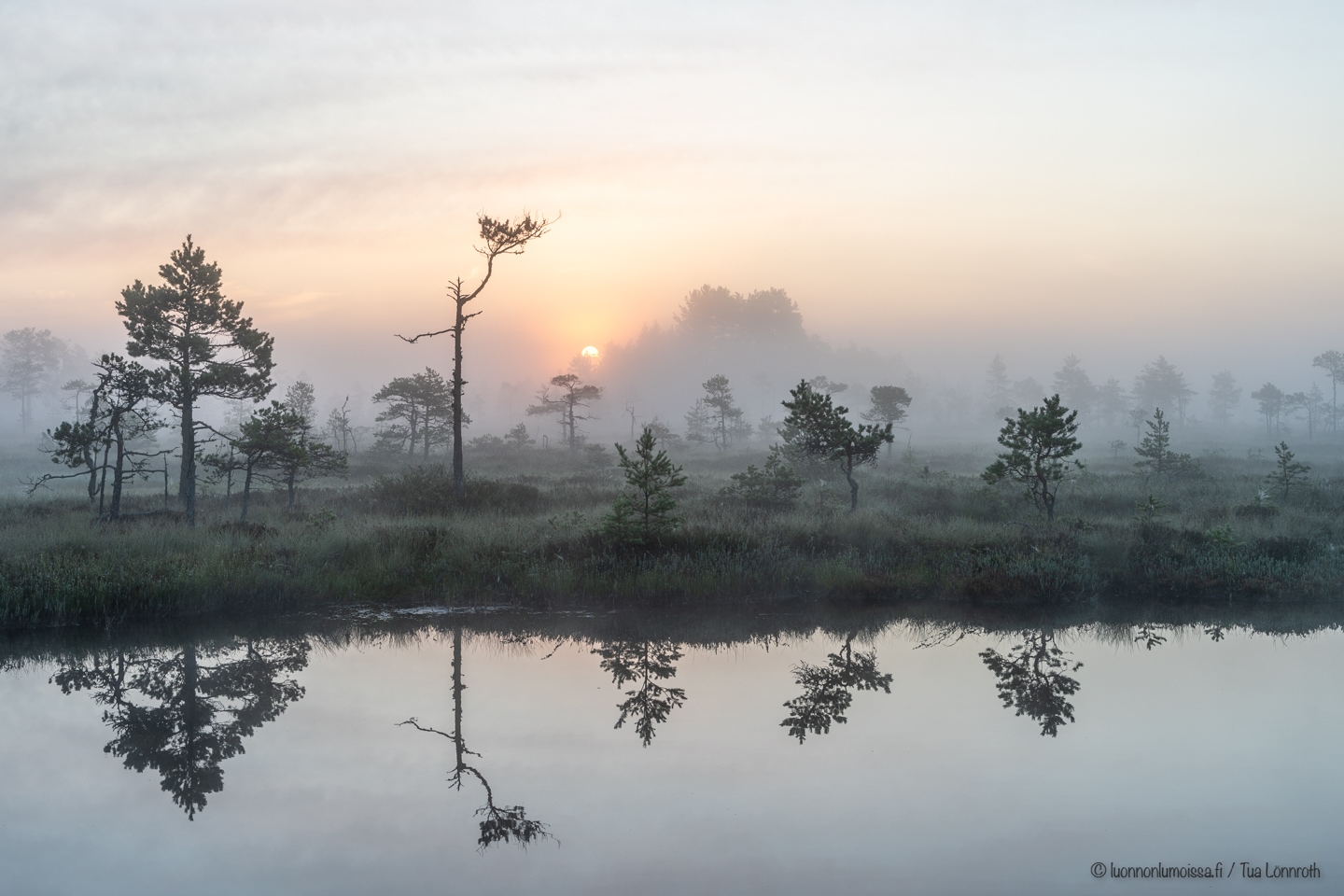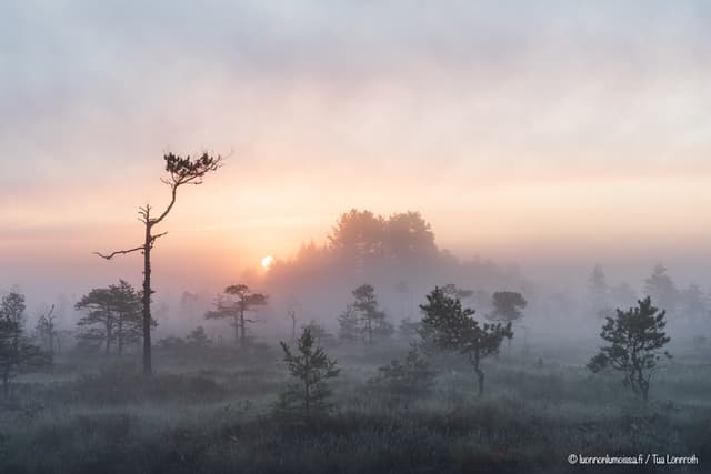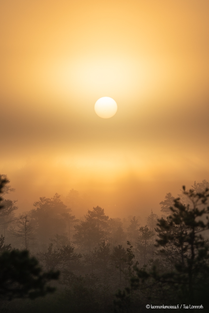 Varhain aamulla usvan kääriessä suon puut pehmeään syliinsä, on suomaisema upeimmillaan. Tunnelma ei voisi olla maagisempi kurkien tai kaakkurien huutojen raikuessa jossakin kauempana. Auringonnousua kuvatessa kannattaa olla nopea, auringonpaiste on nimittäin hetkessä jo aivan liian kova. Jos sumu on tarpeeksi sankka, voi aurinko näyttäytyä kauniina pallona usvan takaa. Joskus sumu sakenee entisestään auringon noustessa, jolloin aurinko häviää usvapilven taakse kokonaan. Aamuisin kun on kastetta, näkyvät hämähäkinverkot hyvin. Mestariteoksia nämäkin, joiden kauneus vain korostuu seitteihin tarttuneiden kastepisaroiden ansiosta. Vielä en ole saanut toivomaani kuvaa näistä, joten harjoittelu jatkukoon.