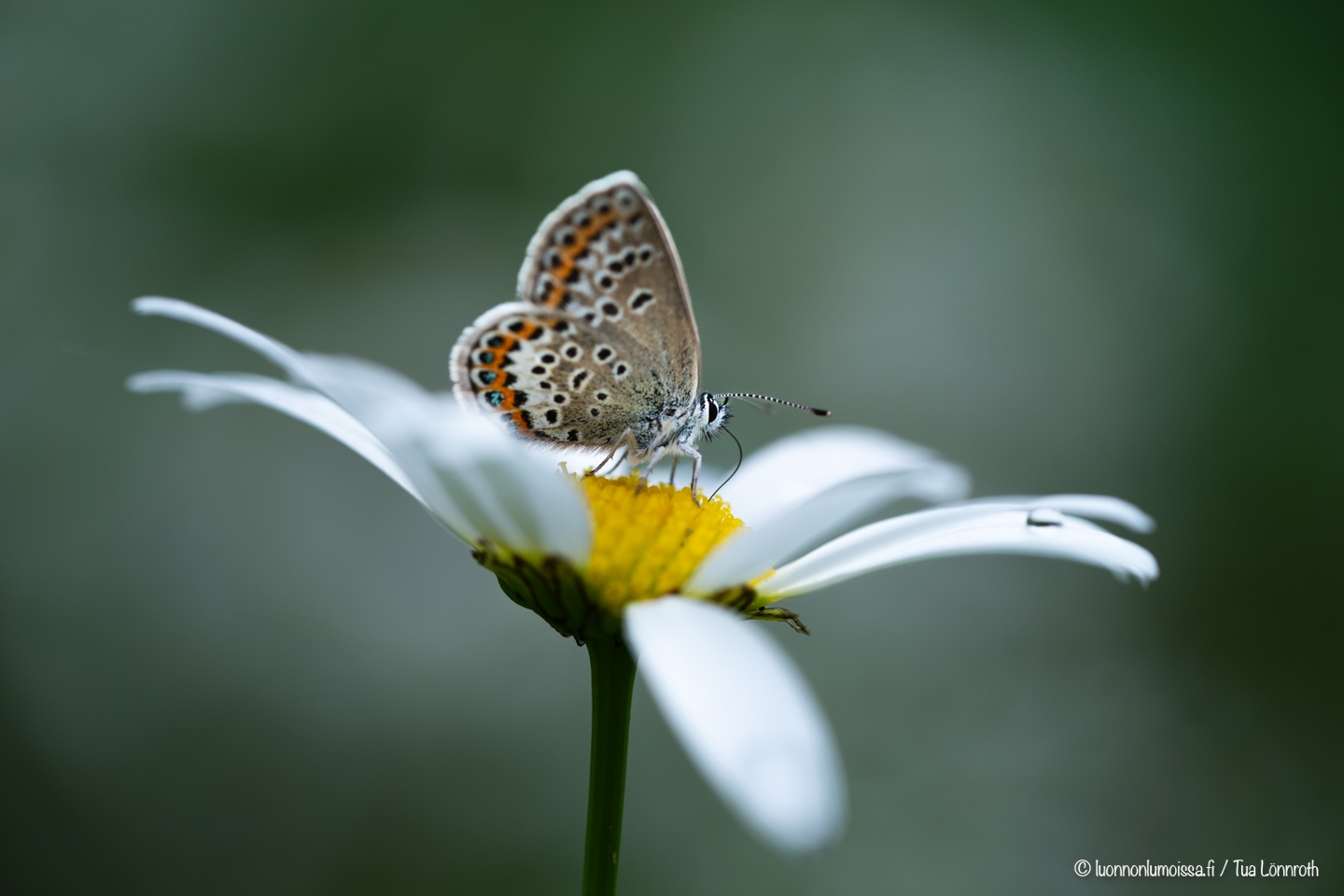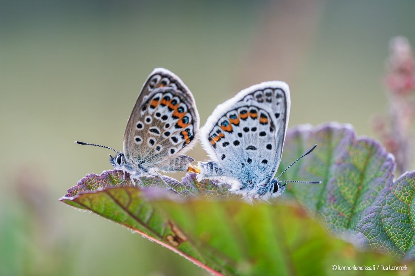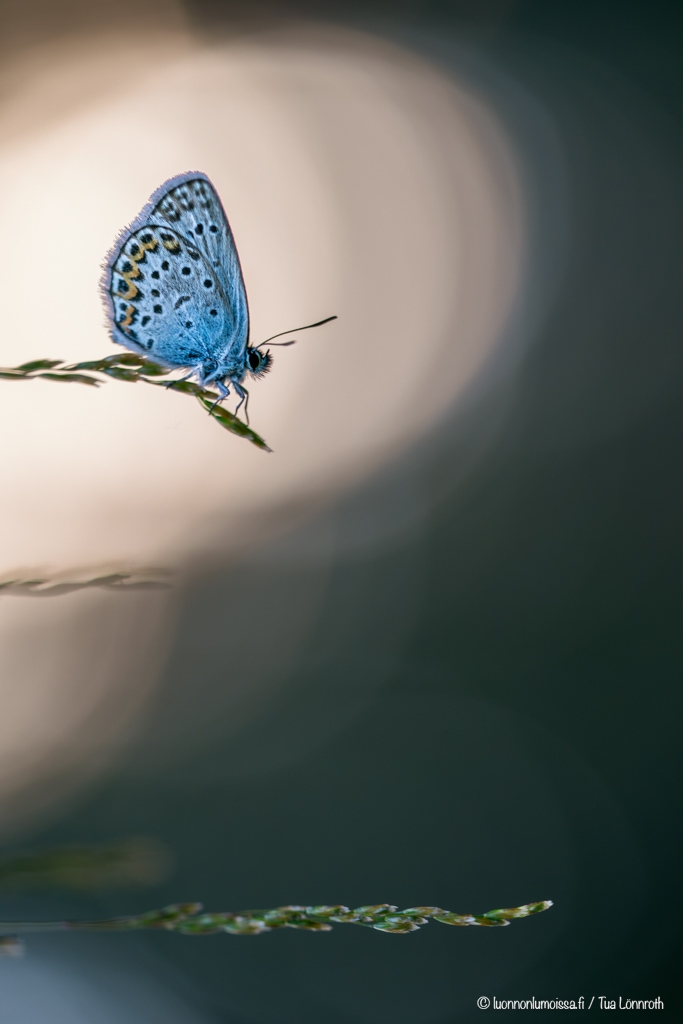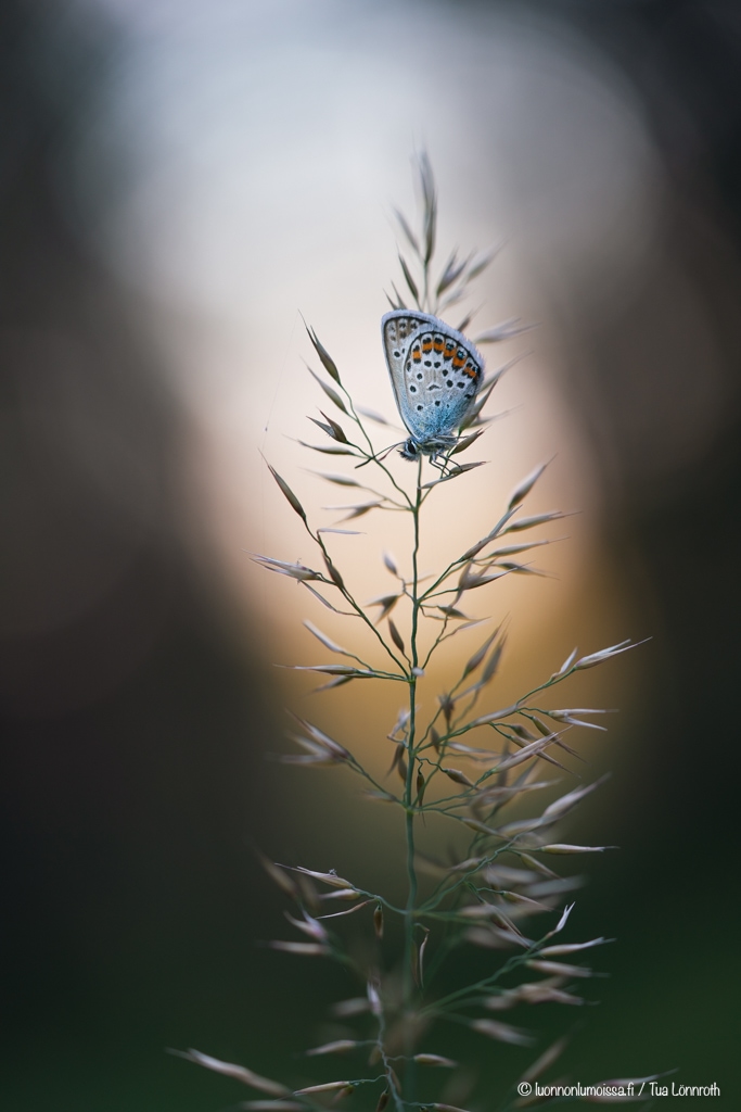 Puolipilvinen sää on oiva perhosten kuvauskeli. Kun aurinko menee pilveen, jäävät perhoset paikalleen ja niitä on silloin helppo kuvata makrolinssillä. On miellyttävämpää kuvata rauhassa kukalla olevaa kuin villisti sinne tänne poukkoilevaa perhosta, ja kuvien kannalta pilvinen keli on tietenkin parempi keskellä päivää. Löysimme sinisiipipariskunnan kesken niiden lemmenleikkien eikä niitä voinut vähempää kiinnostaa meidän häärääminen ympärillä. Kuvasimme niitä pitkähkön tovin ja sinne ne jäivät jatkamaan puuhiaan meidän lähdettyä pois. Suon laidalla metsän puolella oli isompi sinisiipiesiintymä pienellä alueella, jossa ne ruokailivat kukilla. Tulimme vielä illallakin katsomaan, olisivatko ne paikalla ja olivathan ne. Perhoset ottivat vastaan tulevaa yötä heinillä oleskellen. Harmittavasti paikka oli aikamoisessa kuopassa eikä iltavaloja saanut kunnolla hyödynnettyä, mutta jotakin pientä kuitenkin.