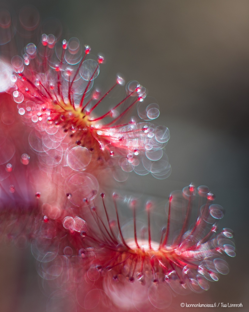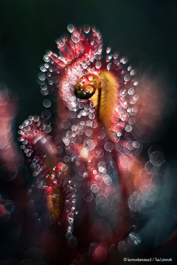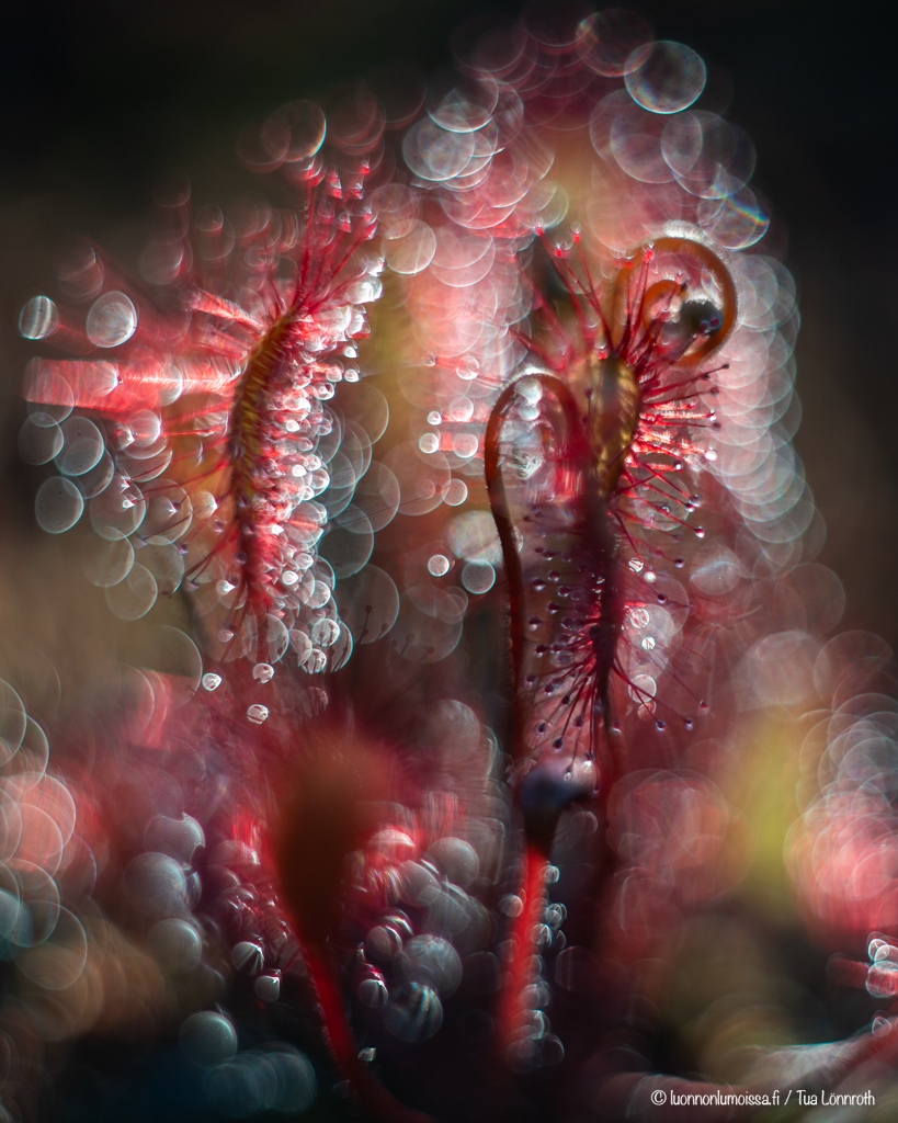 Kihokki on suon erikoisuus limapisaroineen. Se on lihansyöjäkasvi ja saalistaa tahmaisten limapallojensa avulla. Pahaa aavistamaton hyönteinen jää niihin kiinni ja kihokki pääsee käpertymään sen ympärille. Minulla on ollut haaveena saada kunnon bokehmonsteri-kuva kihokista, ja tänä kesänä onnistuin mielestäni aika hyvin. Hitsin vaikeaa hommaa löytää sopiva kihokkikimppu, joka olisi kuvauksellinen. Ei se suolla kykkiminenkään mitenkään helpota asiaa, varsinkin kun pitää olla varovainen ettei tallo näitä kauniita kasveja. Kaiken maailman epäergonomisissa asennoissa on melkoisen tuskallista yrittää löytää parasta mahdollista sommitelmaa.