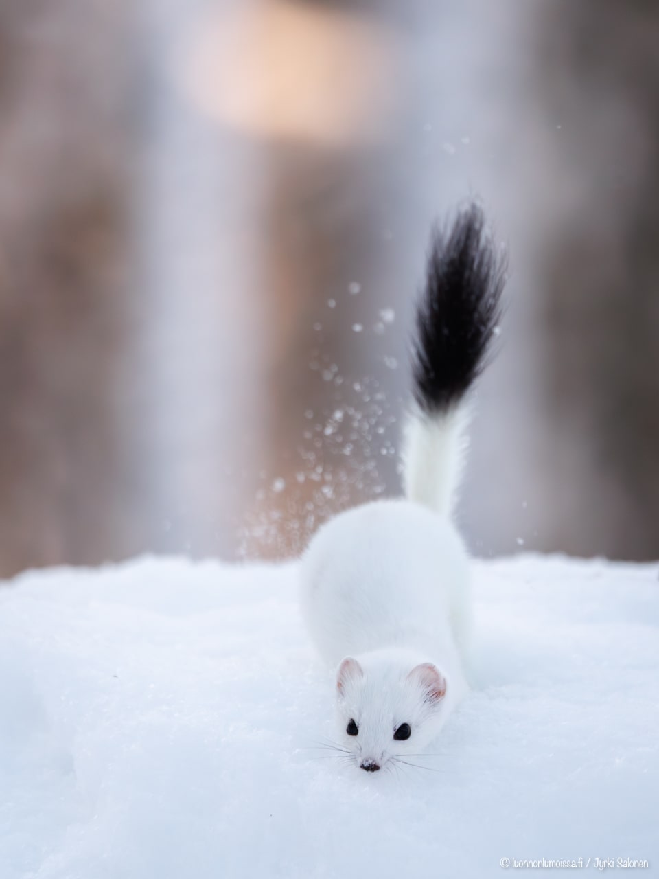Paikan päällä kuvaukset alkoivatkin lennokkaasti, kun musta hännänpää alkoi vilkkua lumihankien välissä ennen kuin olimme saaneet edes kameroita repusta. Muutaman ensimmäisen (lämpimän vastavalosuojan pehmentämän!!) räpsyn jälkeen palattiinkin sitten päiväjärjestykseen, kun kärppä teki kuulemma sille epätyypillisen katoamistempun. Kenties epätyypillistä tälle kärpälle, mutta erittäin tyypillistä meille...