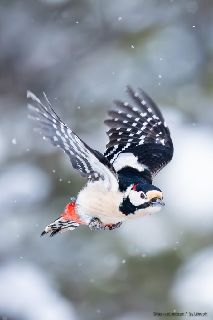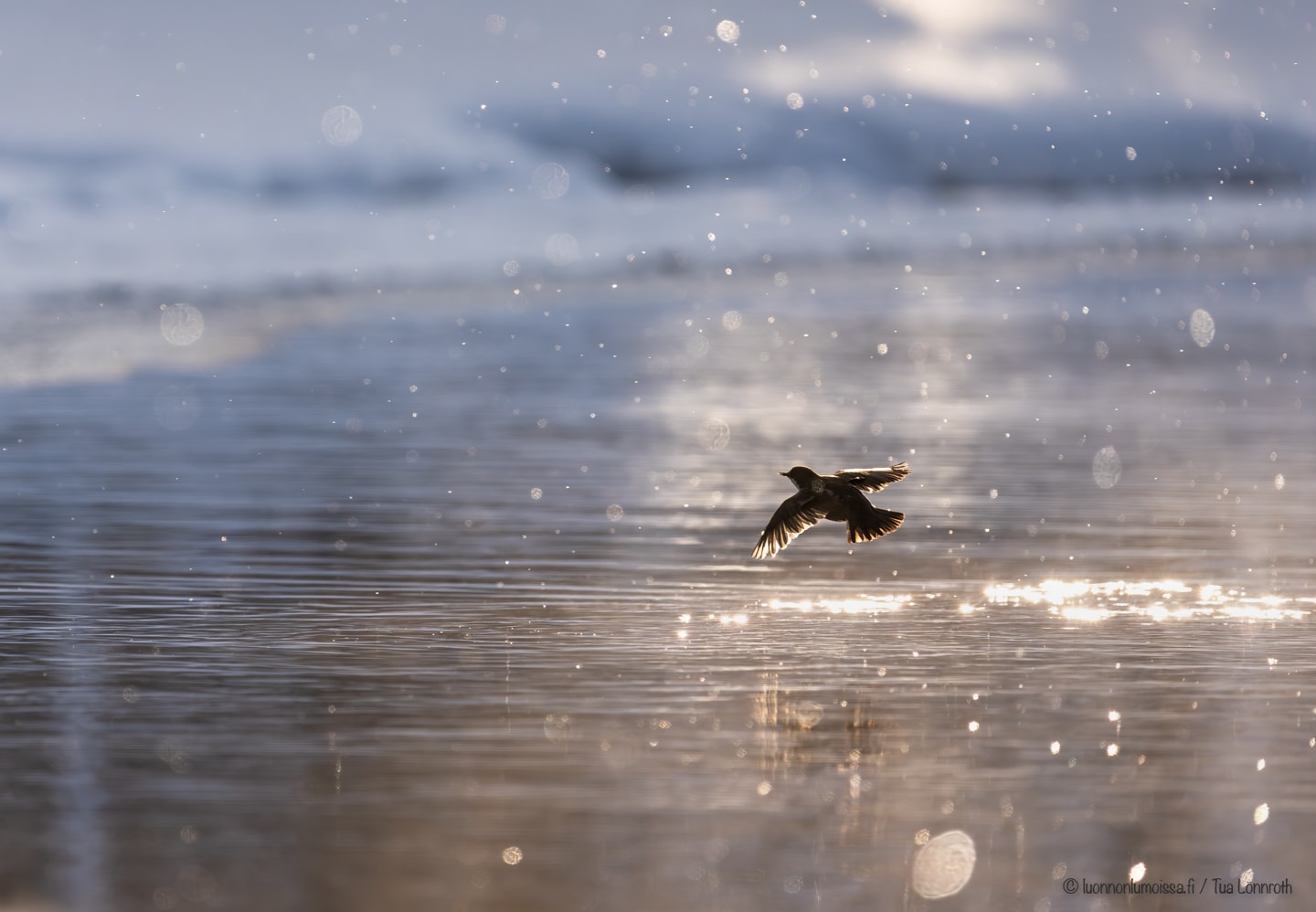 Toisen kerran kun olimme jo lähtemässä pois, alkoi sataa lunta auringon tullessa pilven takaa esiin ja harvinaista taikapölyä leijaili ilmassa vastavaloon katsoessa. Nyt jos koskaan oli aika kuvata, joten palasimme kuvausasemiin satumaiset ”koko maailman valokuvauskilpailujen voittokuvat” mielessä. Kamera vaan oli aivan toista mieltä. Tarkentaminen oli ihan mahdotonta vastavalossa hohtaneiden lumihiutaleiden takia. Lisäksi linnut olivat suurimmaksi osaksi aikaa todella kaukana ja paikallaan olevista koskikaroistakin oli vaikea saada teräviä kuvia koskesta nousevan höyryn takia. Kameraa oli pidettävä silmän korkeudella, koska takanäytöstä ei nähnyt auringonpaisteelta mitään, ja asettihan korkea lumipenkkakin omat haasteensa. Jos mieli saada lentokuvaa näissä maagisissa olosuhteissa oli tarkennettava johonkin kohtaan koskea ja toivoa, että lentävä kara osuu juuri siihen. Aivan uskomattomalla tuurilla yksi lensi oikeasta kohdasta ja sain tästä kauniista mutta ohikiitävästä hetkestä yhden ainoan mukavan kuvan. Ei mitään kilpailuainesta todellakaan, kuvakulma oli tylsä liian korkealla olevan kameran takia ja lintukin lensi poispäin, mutta tämä pelasti kuitenkin päiväni.