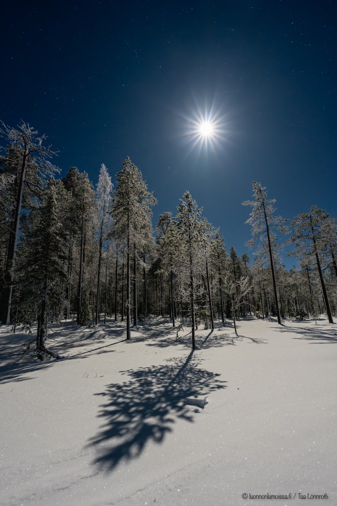 Illaksi odotimme malttamattomana luonnon omaa ilotulitusta. Varasimme paljon vaatetta päälle viime kerrasta viisastuneina. Lähdimme suolle mutta avaruussää oli rauhallista. Pakkasta oli nyt 25 astetta ja onneksi täysin tyyntä. Puunrungot paukkuivat tunnelmallisesti kylmästä johtuen ja oksat olivat kuuralla kuorrutettuja. Olosuhteet olivat muuten kohdillaan, mutta reposia ei vaan ollut. Miksi aina näin…