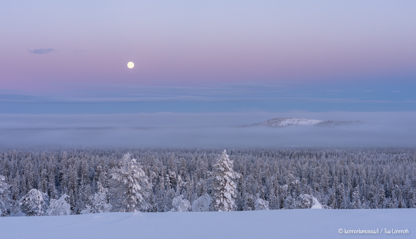 Lähtöpäivänä ehdimme hyvin poiketa Luostolla ennen illalla lähtevää junaa. Olimme ehtineet kävellä jo kilsan verran kun tajusimme, että polku ei lähdekään nousemaan tunturiin. Päätimme kääntyä takaisin autolle hakemaan lumikengät, että päästäisiin lumessa kahlaten tunturia ylöspäin. Sitten ryntäsimme takaisin aivan järjettömässä hiessä, tuntui että pää räjähtää. Pakkasta oli 33 astetta, tunturissa 10 astetta lämpimämpää, mutta liikkeessä tuota kylmyyttä ei huomaa. Löytyihän sitten se reittikin tunturille, jota olisi hyvin voinut kävellä ihan normikengillä. Kyltti oli kätevästi puiden takana, ei ihme että ensin kävelimme ohi. Keli oli mitä parhain ja täysikuu paistoi rauhallisesti taivaalla. Pakkassumua oli kertynyt laaksoon ja maisemat olivat kertakaikkisen satumaiset. Kohtasimme ainoastaan muutaman ihmisen, liekö pakkanen rajoittanut ihmismäärää.