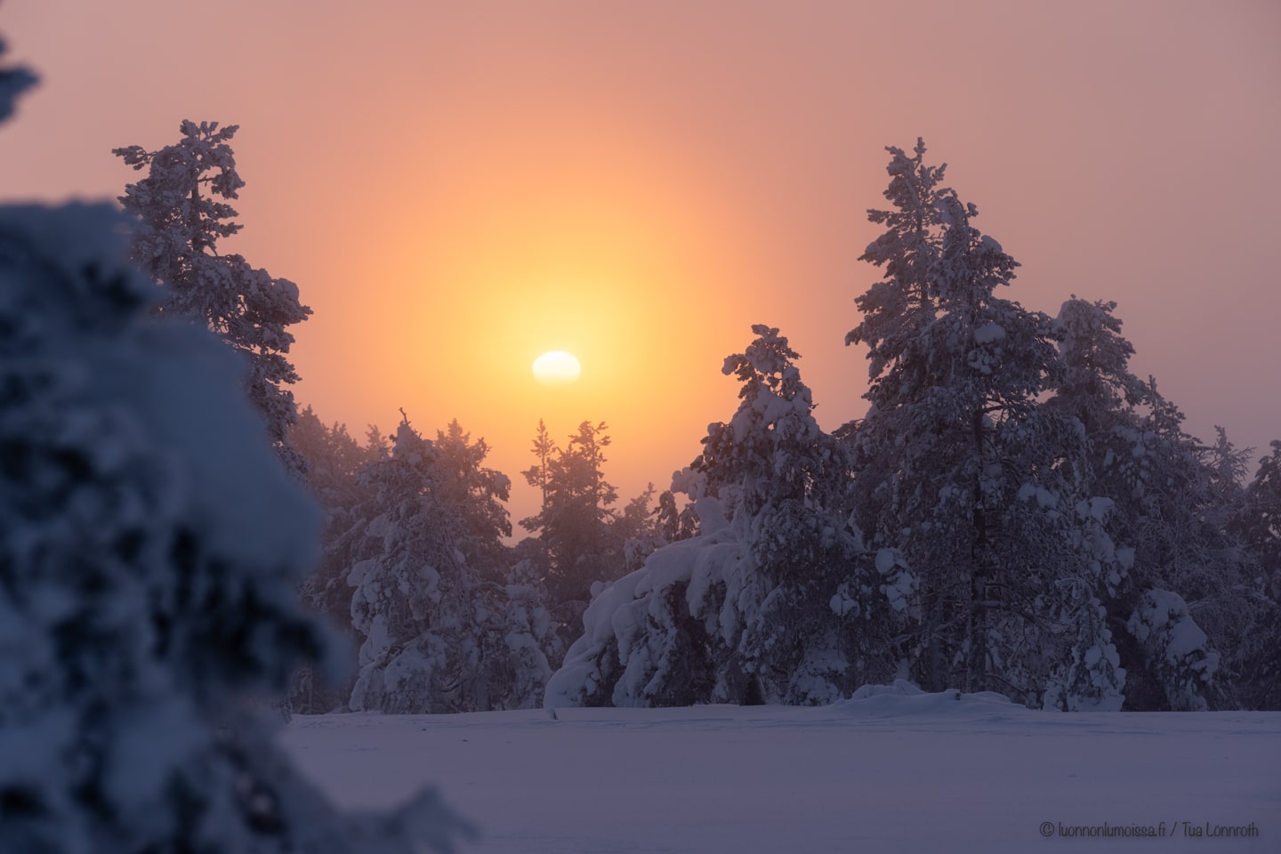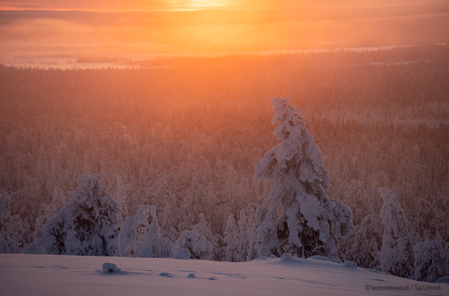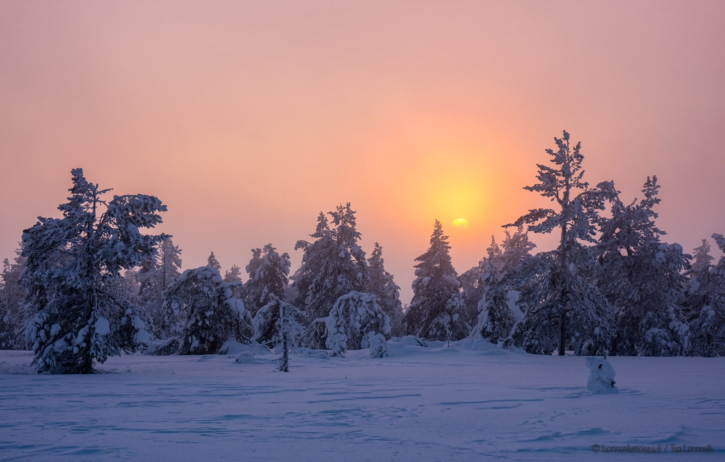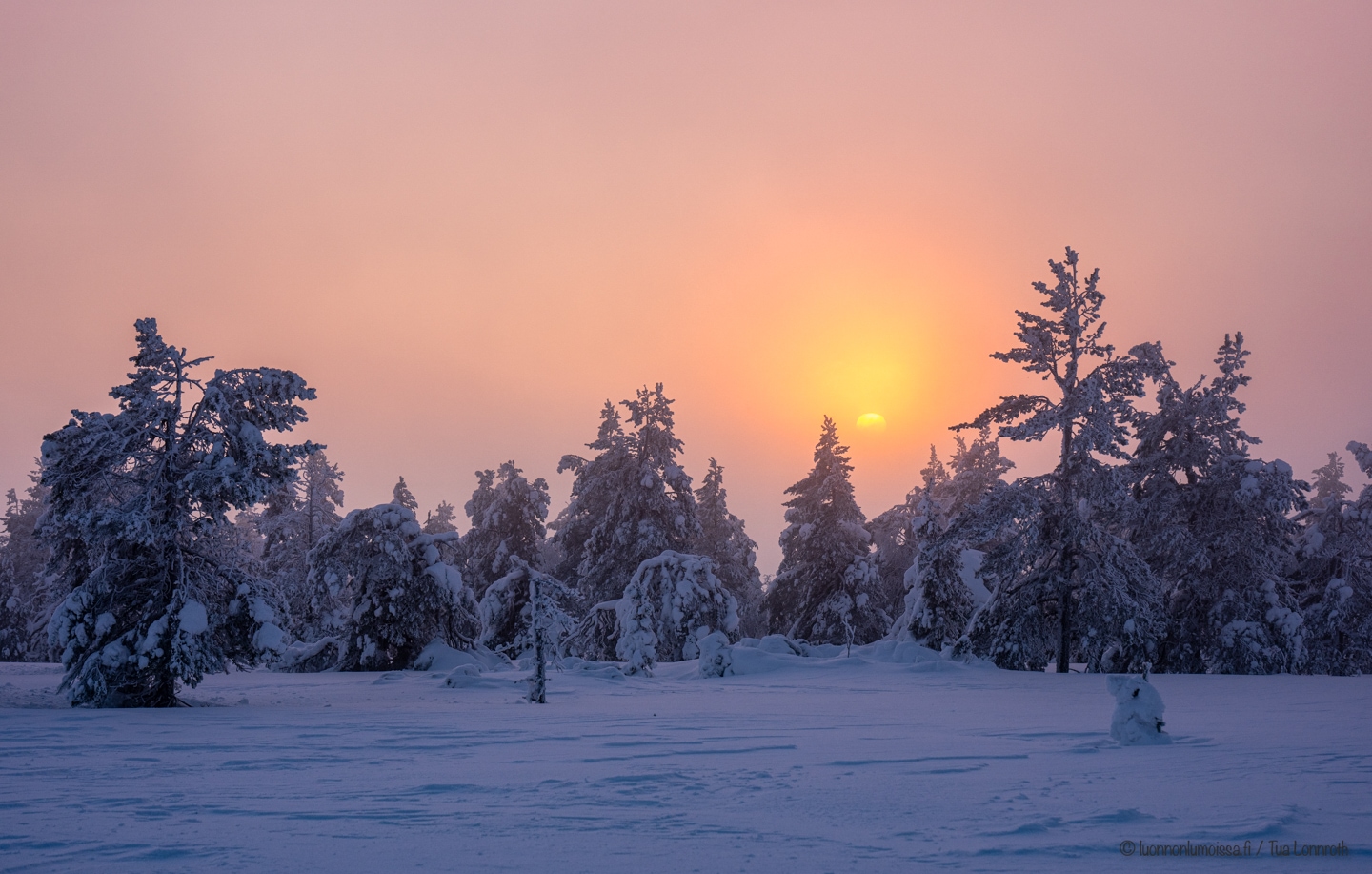Pakkanen kiristyi pikku hiljaa ja viemärin haju mökissä väistyi. Mökki osoittautui muutenkin kelpopeliksi, kaikki toimi hyvin ja oli lämmin, vaikka jää tunkeutuikin loppuviikolla ikkunoiden sisäpuolelle. Vuoden toiseksi viimeisenä päivänä lähdimme ajamaan kohti Luostoa. Ihme kyllä puut olivat säilyneet täällä myrskyn jäljiltä huomattavasti paljon lumisempana ja jo matkan varrella alkoi tulla kaivattua talven ihmemaa-fiilistä. Tunturille kavutessa sitä vasta tulikin, tykkylumipuiden keskellä tuntui epätodelliselta matalalta paistaneen auringon värjätessä maisemaa hattaran sävyiseksi. Tällaista kaamoksen tunnelmaa tulimme hakemaan ja sitä vihdoin saimme! Turisteja täälläkin riittää hulinaksi asti mutta kun lähdimme kävelemään lumikenkäreittiä pitkin tunturin päällä, saimme olla rauhassa ja täydellisessä hiljaisuudessa. Avoimella paikalla kävi vieläkin melko kova puhuri mutta puiden siimeksessä ei tuullut yhtään.