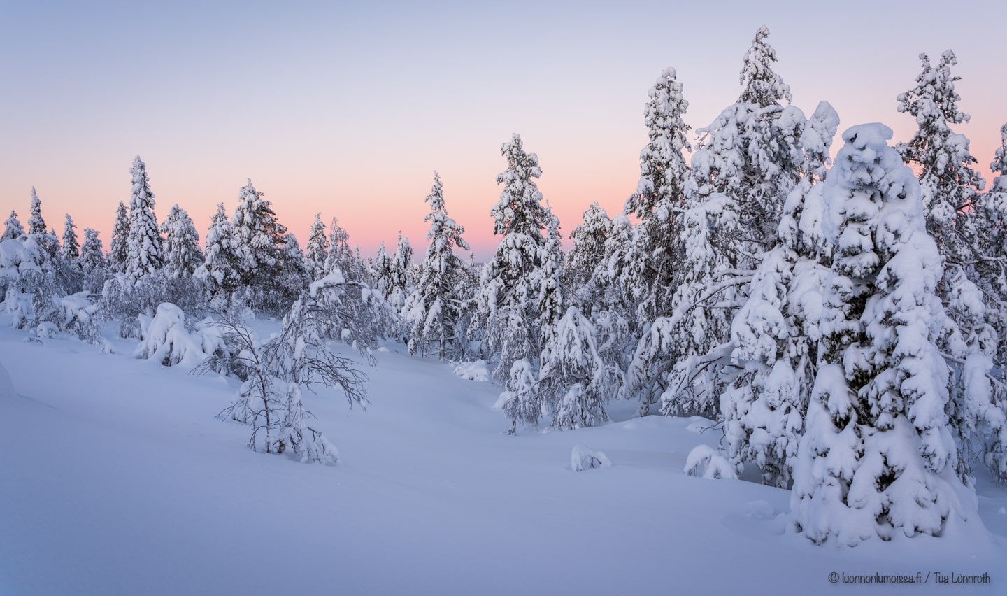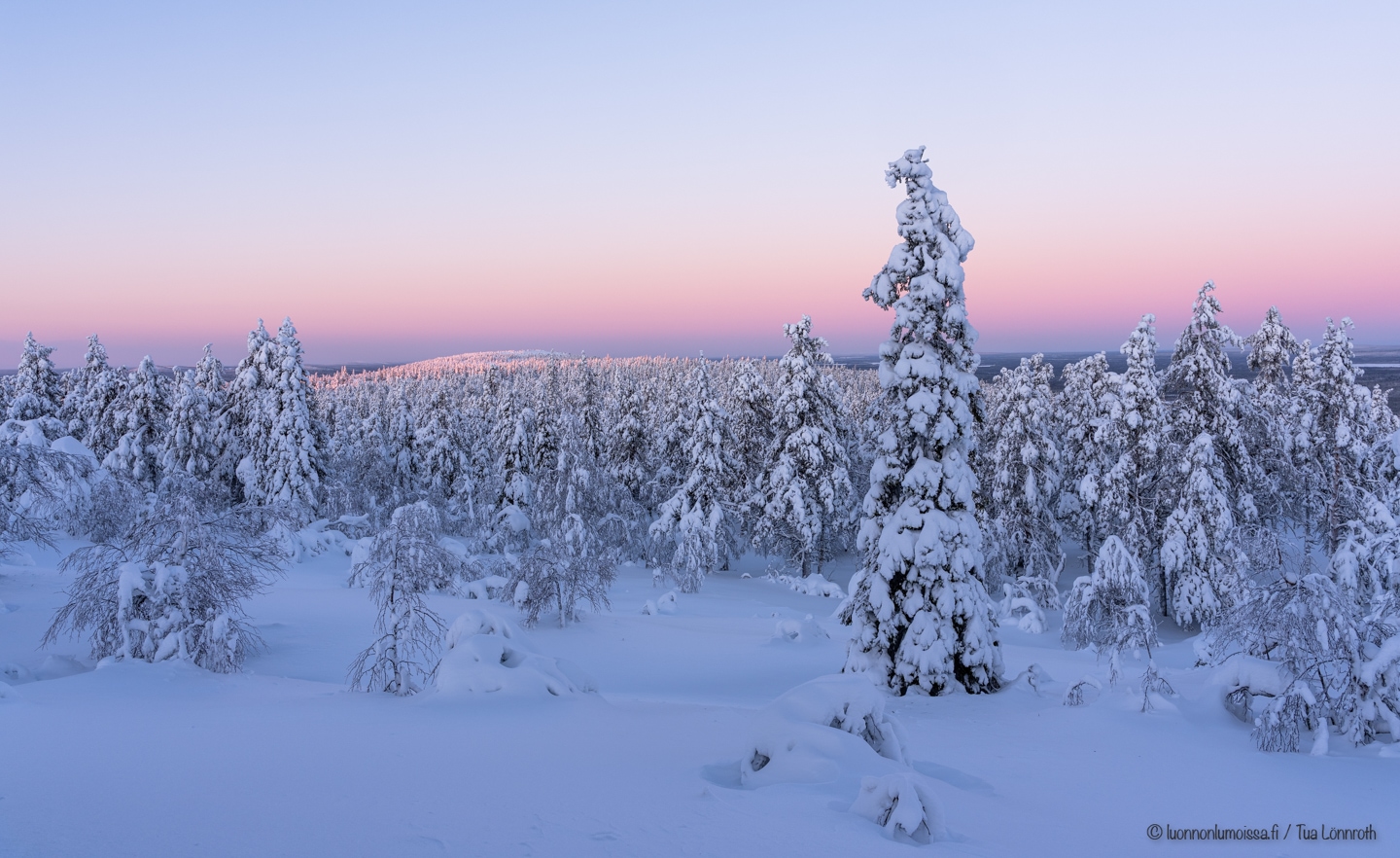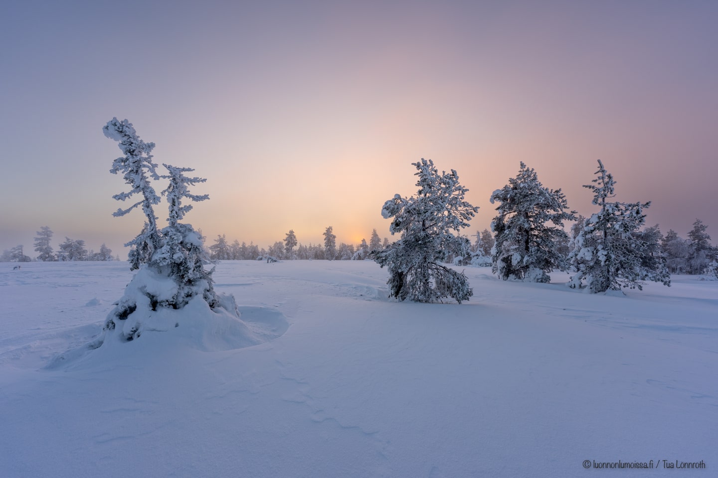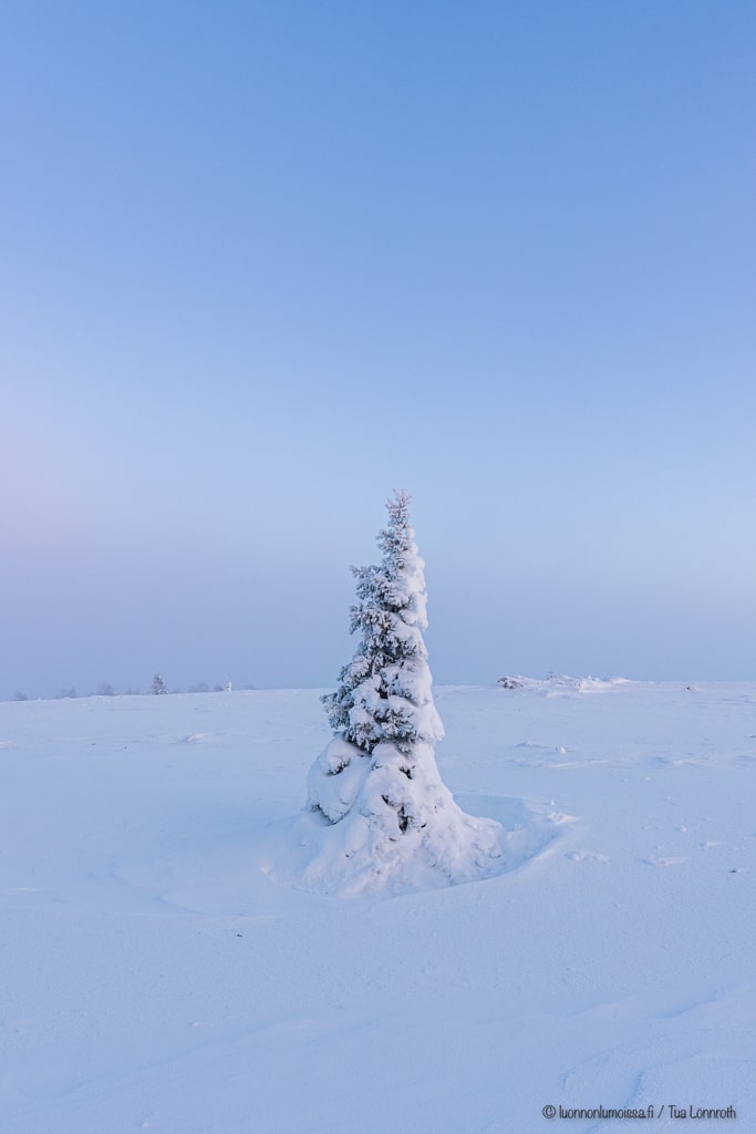 Pakkanen kiristyi pikku hiljaa ja viemärin haju mökissä väistyi. Mökki osoittautui muutenkin kelpopeliksi, kaikki toimi hyvin ja oli lämmin, vaikka jää tunkeutuikin loppuviikolla ikkunoiden sisäpuolelle. Vuoden toiseksi viimeisenä päivänä lähdimme ajamaan kohti Luostoa. Ihme kyllä puut olivat säilyneet täällä myrskyn jäljiltä huomattavasti paljon lumisempana ja jo matkan varrella alkoi tulla kaivattua talven ihmemaa-fiilistä. Tunturille kavutessa sitä vasta tulikin, tykkylumipuiden keskellä tuntui epätodelliselta matalalta paistaneen auringon värjätessä maisemaa hattaran sävyiseksi. Tällaista kaamoksen tunnelmaa tulimme hakemaan ja sitä vihdoin saimme! Turisteja täälläkin riittää hulinaksi asti mutta kun lähdimme kävelemään lumikenkäreittiä pitkin tunturin päällä, saimme olla rauhassa ja täydellisessä hiljaisuudessa. Avoimella paikalla kävi vieläkin melko kova puhuri mutta puiden siimeksessä ei tuullut yhtään.
