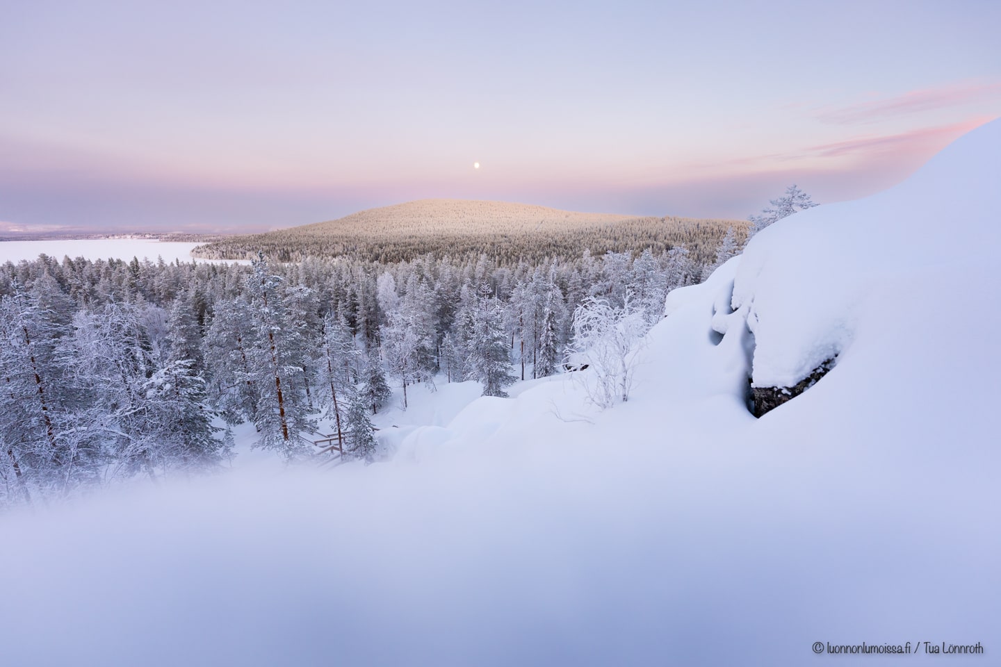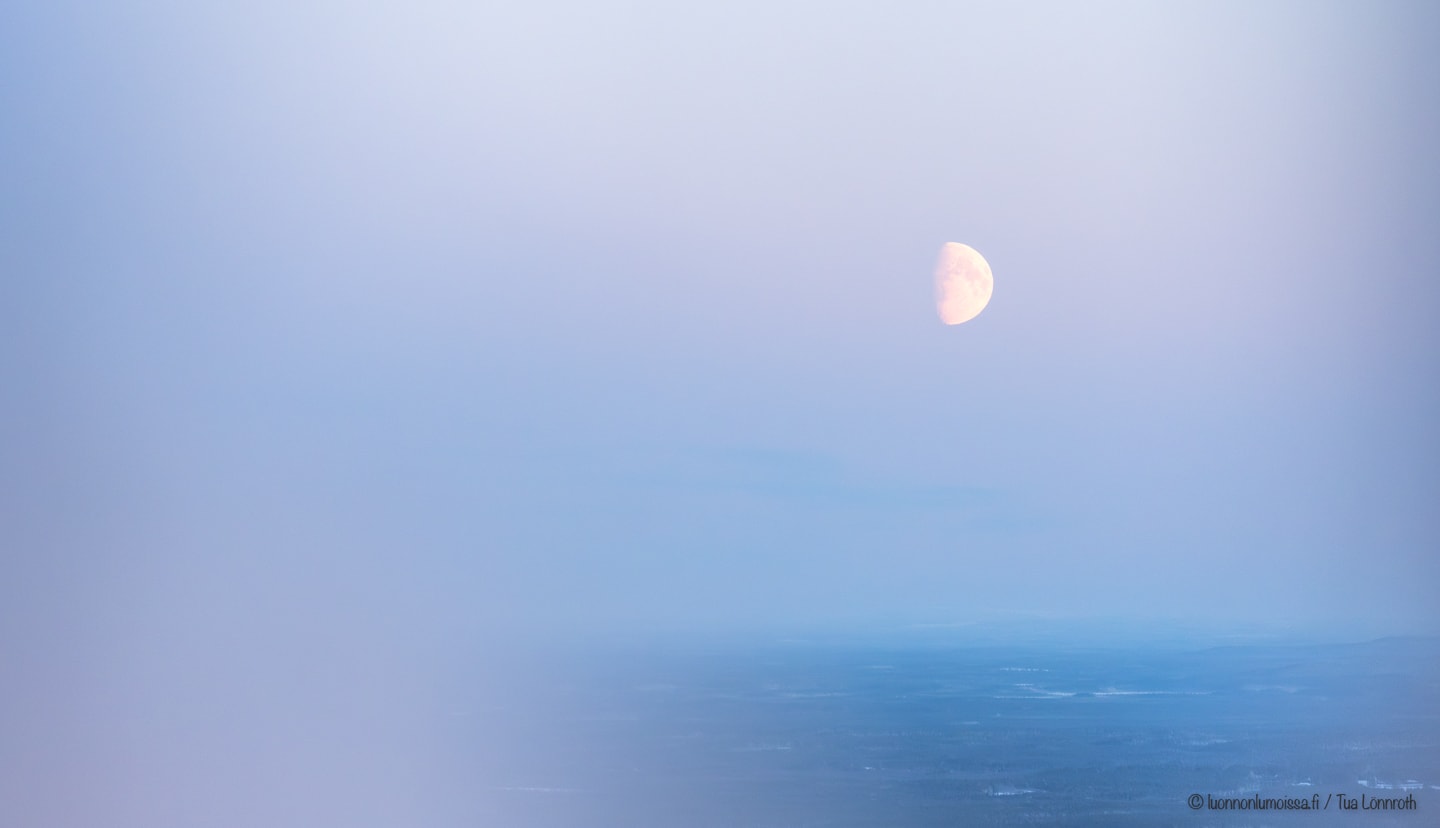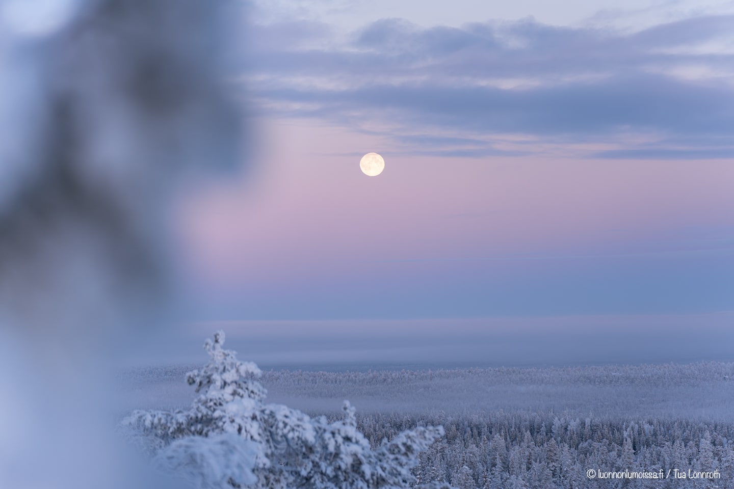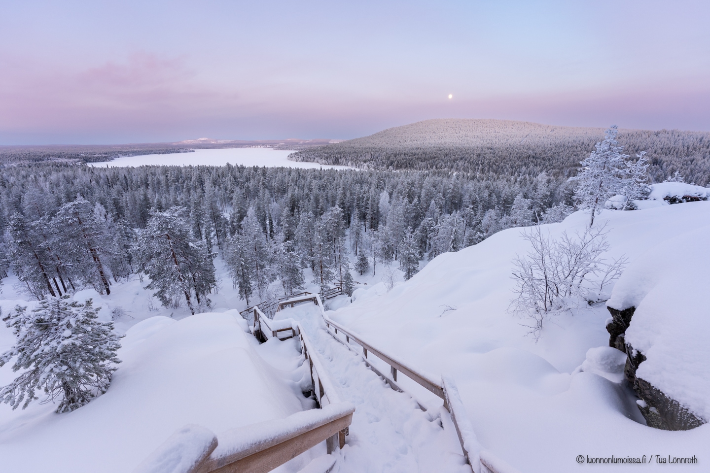 Seuraavana päivänä satoi lunta ja kävimme tekemässä vuoden ekat reippailut suon ympäristössä. Illallakin oli pilvistä, joten oli mukava vain ottaa rennosti mökillä saunoen ja sarjoja katsellen. Toiseksi viimeisenä päivänä lähdimme katsomaan pääsisikö kurulle näin talviaikaan. Pakkanen oli kiristynyt lähes 30 asteeseen. Edessä oli talvihuollon piiriin kuulumattomat jyrkät ja lumiset portaat. Kapuaminen oli jopa vähän pelottavaa mutta kaiken sen arvoista; näkymät yllättivät komeudellaan. Aluksi oli pilvistä mutta aurinko värjäsi kauniisti tunturin pinkiksi. Sitten kirkastui ja kuu tuli esille. Eihän tällaista maisemaa voi uskoa todeksi!