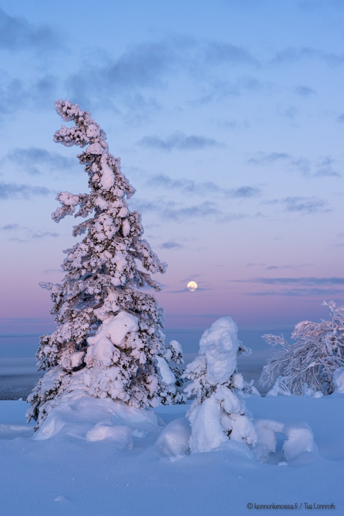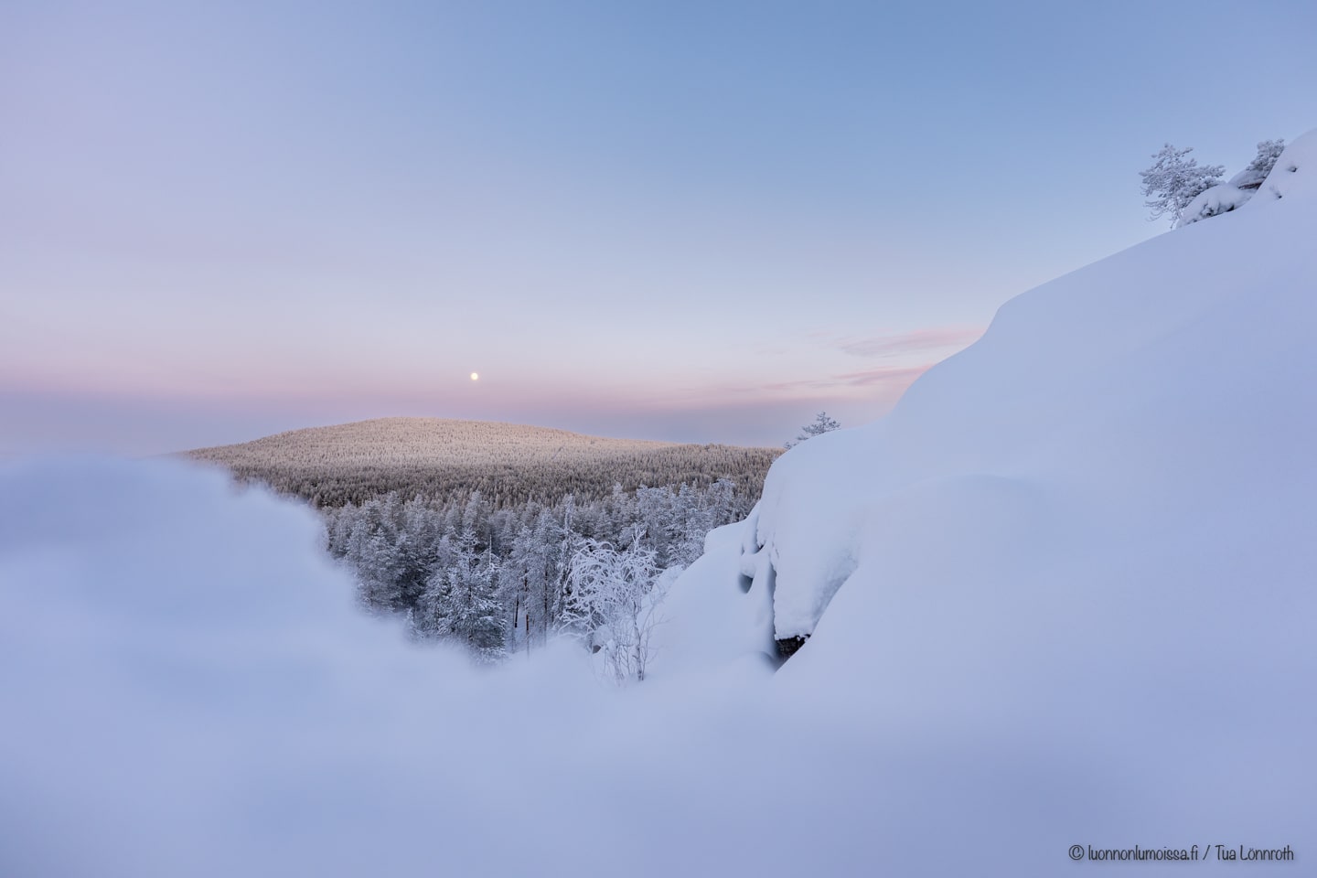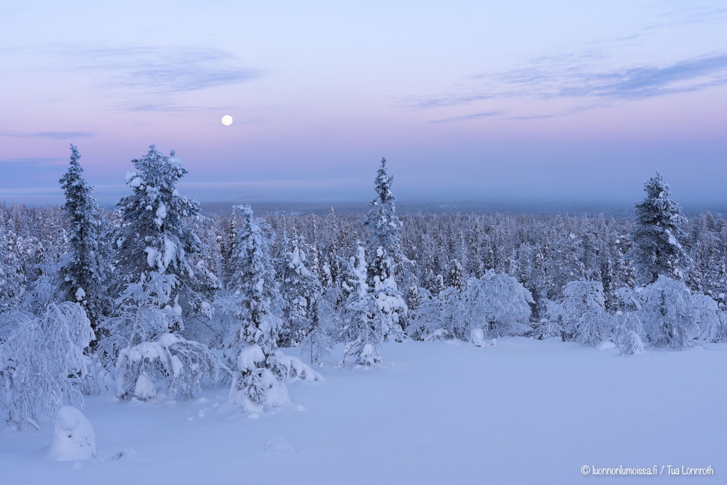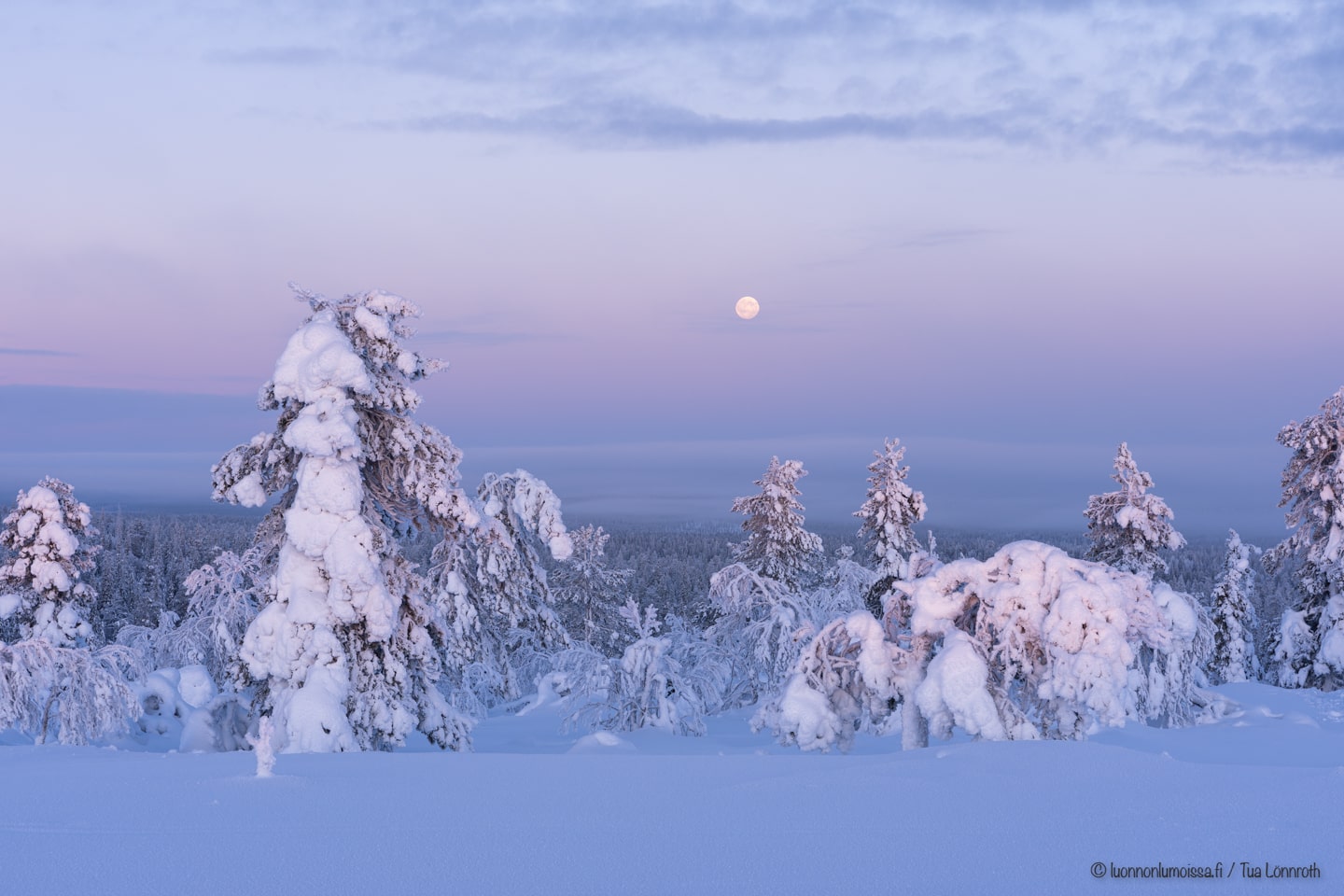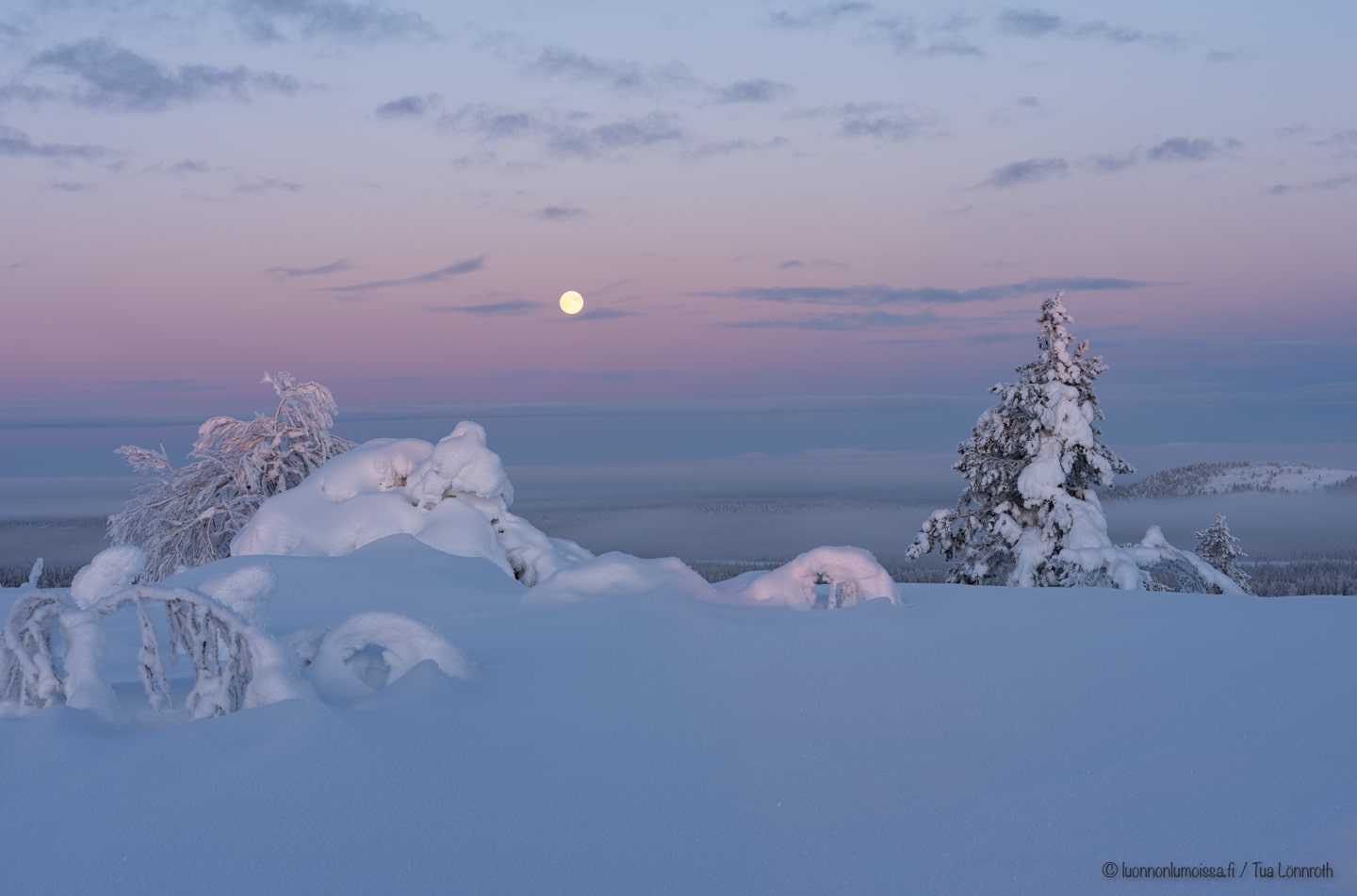 Seuraavana päivänä satoi lunta ja kävimme tekemässä vuoden ekat reippailut suon ympäristössä. Illallakin oli pilvistä, joten oli mukava vain ottaa rennosti mökillä saunoen ja sarjoja katsellen. Toiseksi viimeisenä päivänä lähdimme katsomaan pääsisikö kurulle näin talviaikaan. Pakkanen oli kiristynyt lähes 30 asteeseen. Edessä oli talvihuollon piiriin kuulumattomat jyrkät ja lumiset portaat. Kapuaminen oli jopa vähän pelottavaa mutta kaiken sen arvoista; näkymät yllättivät komeudellaan. Aluksi oli pilvistä mutta aurinko värjäsi kauniisti tunturin pinkiksi. Sitten kirkastui ja kuu tuli esille. Eihän tällaista maisemaa voi uskoa todeksi!