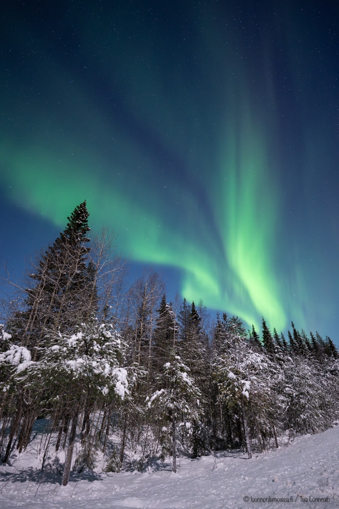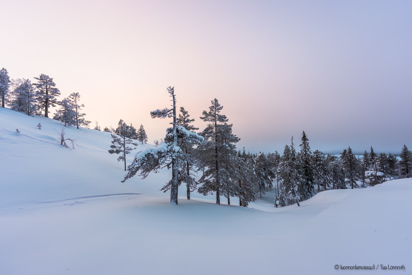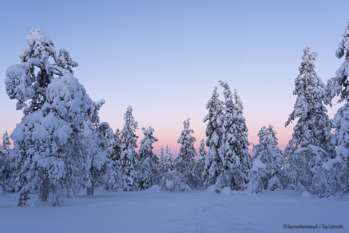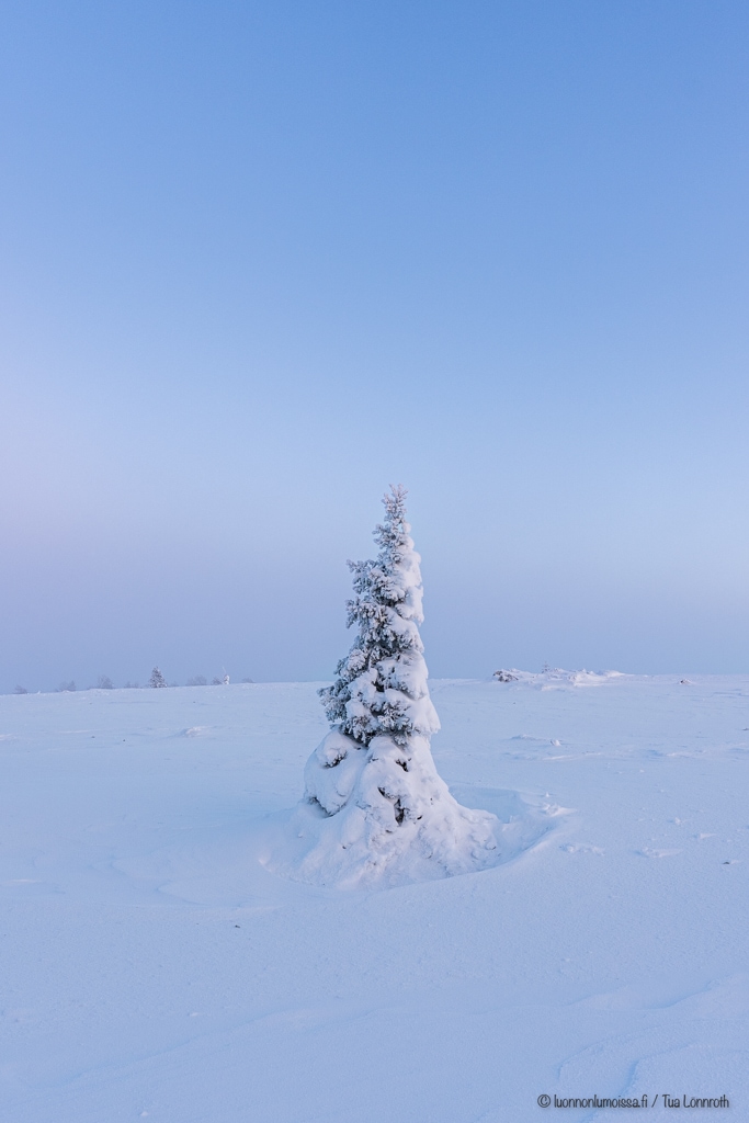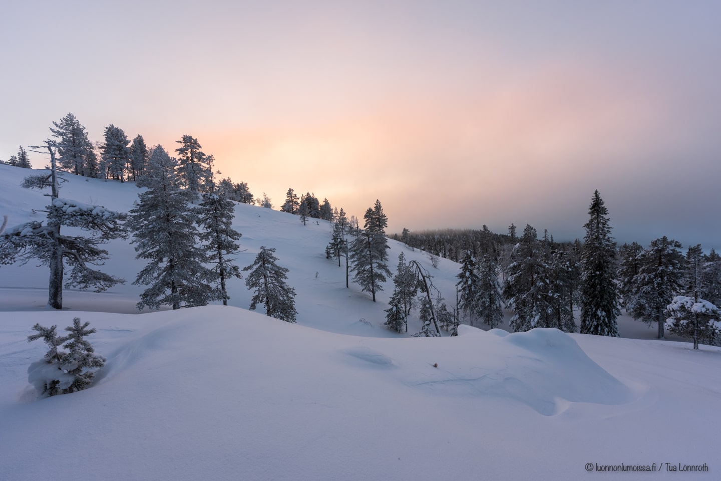Olemme muutaman vuoden viettäneet joululomaa Kuusamossa. Aivan liian moni reissu on ollut pilvinen, lämmin ja tuulinen sekä sen myötä vähäluminen, joten tänä vuonna päätimme lähteä kokeilemaan uutta paikkaa. Olimme saapuneet Pyhälle. Perinteet kuitenkin seurasivat perässä ja illalla tuuli yltyi myrskyksi, lämpötilan noustessa nollaan. Aivan käsittämätöntä, miten valkoisena hohtavat puut muuttuivat jälleen mustaksi HETI meidän saavuttua paikalle. Pientä toivoa antoi kuitenkin seuraaville päiville povatut pakkaset, vaikka takaraivossa takoi pelko, että niitä ei tulekaan. Sääennusteen muuttuminen huonompaan suuntaan ei olisi ensimmäinen kerta.