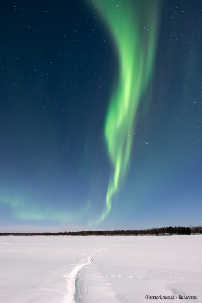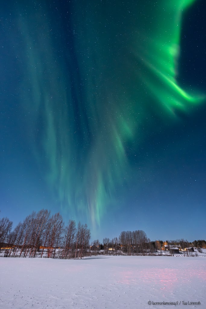 Illaksi luvattiin kirkasta, joten lähdimme suon laidalle katsomaan, näkyisikö revontulia. Pakkasasteita oli jotain 15 mutta tuuli oli niin kova, että emme kestäneet jäädä seisomaan ja odottelemaan tulia. Miten voi olla, että näin kireällä pakkasella tuulee!? Oli pakko lähteä ajelemaan ja lämmittelemään. Puolisen tunnin sisällä alkoi roihuta ja arvata saattaa, että eihän sitä sopivaa kuvauspaikkaa äkkiseltään mistään löytänyt. Talvella ei löydy pysähdyspaikkojakaan kun niitä ei aurata. Suuntasimme kohti rantaa omakotialueen läpi. Saimme jalustat pystytettyä kun alkoi kuulua koiran räksytystä joltain lähialueen talon pihalta. Tuli sellainen tunne, että koira oli päästetty tahalleen pihalle haukkumaan, jotta tunkeilijat saataisiin häädettyä. Muutamat hätäiset kuvat tuli otettua ja sitten oli pakko lähteä pois. Harmitti, koska taivas jatkoi leiskumistaan, mutta saatiinpahan me jo enemmän kuin Kuusamossa koskaan, missä emme ole revontulia päässeet kuvaamaan ollenkaan. Mökille mennessä tuli vielä pysähdettyä tien viereen pienelle mökkitielle ja otettua jokunen kuva, mutta tylsä paikkahan se oli. Mökkitietä eteenpäin oli portti, johon oli piirretty pääkallon kuva. Pohjoisessa ollaan tarkkoja siitä, ettei kukaan tule vahingossakaan omalle tontille.